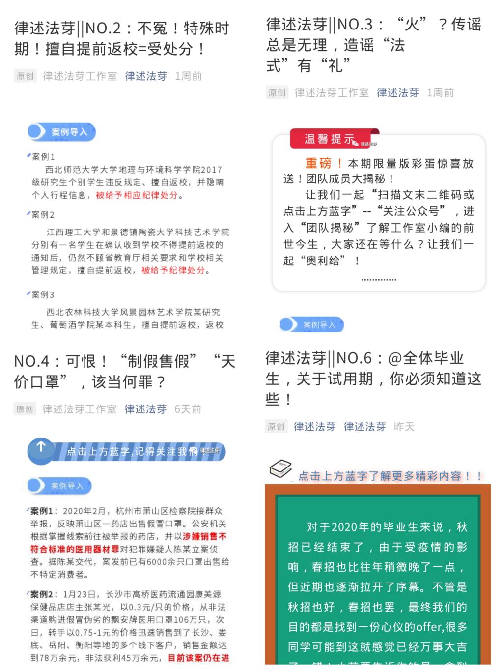 為進一步增強廣大師生“學(xué)法、知法、懂法、守法”的法治觀念,電智學(xué)院輔導(dǎo)員劉貝民牽頭成立了“律述法芽工作室”,及時將國家政策、輿論熱點和自身專業(yè)相結(jié)合,從法律的角度進行解讀、宣傳。原創(chuàng)《拘!疫情當下,拒不配合防控措施可能涉及犯罪》、《不冤!特殊時期!擅自提前返校=受處分!》和《“火”?傳謠總是無理,造謠“法式”有“禮”》等10余篇文章,引導(dǎo)學(xué)生遵守紀律,不擅自返校,勿聽勿信謠言。