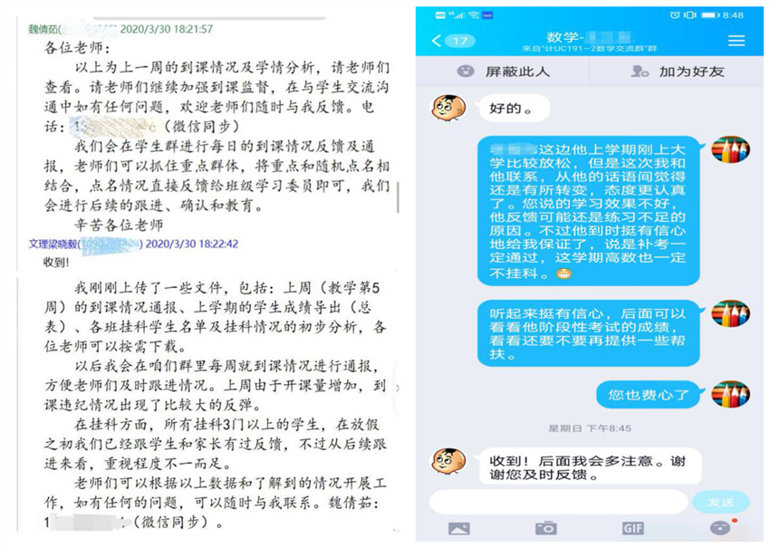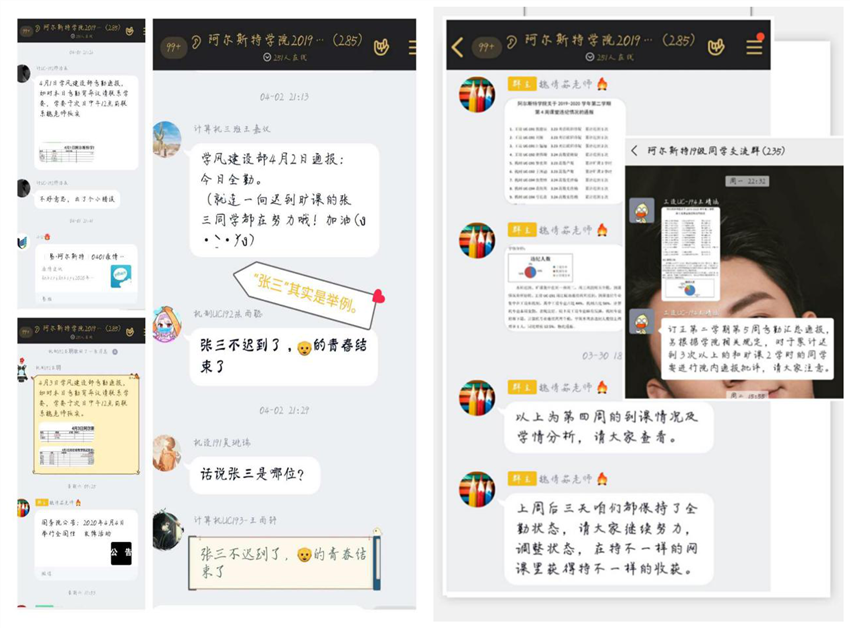 謀合力——育人力量同向同行。學院形成全員育人工作格局,構建包括教學、學工、任課教師、學業(yè)導師、學生家長在內的協(xié)同工作機制,加強信息互通,提升助學針對性。學院深入分析研判2019-2020學年第一學期的學習情況,加強對于學習困難學生的跟蹤、指導及反饋;每周將當周學生到課違紀及學情分析情況通報上傳至任課教師及學業(yè)導師QQ群,便于老師精準施策,凝聚育人正能量,構建助學同心圓,切實增強工作效果。