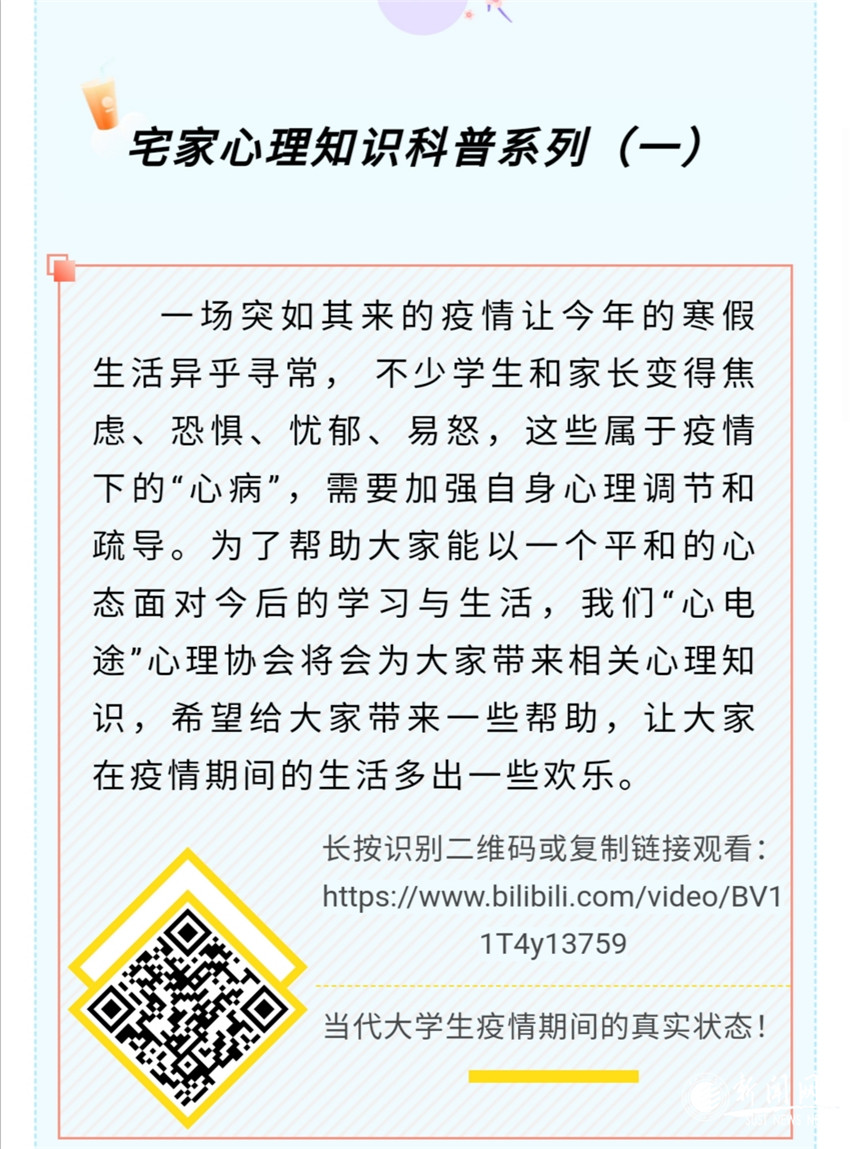 活動(dòng)期間,學(xué)院在公眾號(hào)上,進(jìn)行心理云推送,科普心理危機(jī)應(yīng)對(duì)知識(shí),推送了多期抗“疫”心理健康專題推文?!澳氵€好嗎”,讓學(xué)生對(duì)于心理應(yīng)激有了清晰的認(rèn)識(shí);“表達(dá)愛(ài)”,從積極心理學(xué)角度讓學(xué)生體會(huì)了表達(dá)愛(ài)的具體方式;“宅家心理知識(shí)科普系列”多角度宣傳了學(xué)習(xí)心理、情緒調(diào)節(jié)等心理健康知識(shí)。