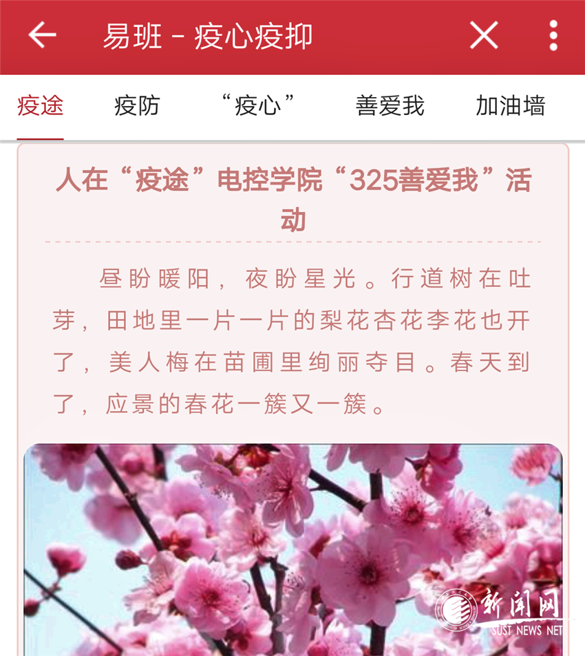 3月25日,活動(dòng)伊始,電控學(xué)院心理協(xié)會(huì)在易班搭建心理云傾訴平臺(tái),人在“疫途”活動(dòng)為學(xué)生提供心靈陪伴“樹(shù)洞”,作為心理育人宣傳季啟動(dòng)儀式,號(hào)召學(xué)生分享居家隔離期間學(xué)習(xí)、生活心得、收獲與感悟,以學(xué)生喜聞樂(lè)見(jiàn)的方式,搭建溝通橋梁,在增進(jìn)相互理解交流的同時(shí),發(fā)揮青年學(xué)生健康向上、積極樂(lè)觀的先進(jìn)導(dǎo)向。