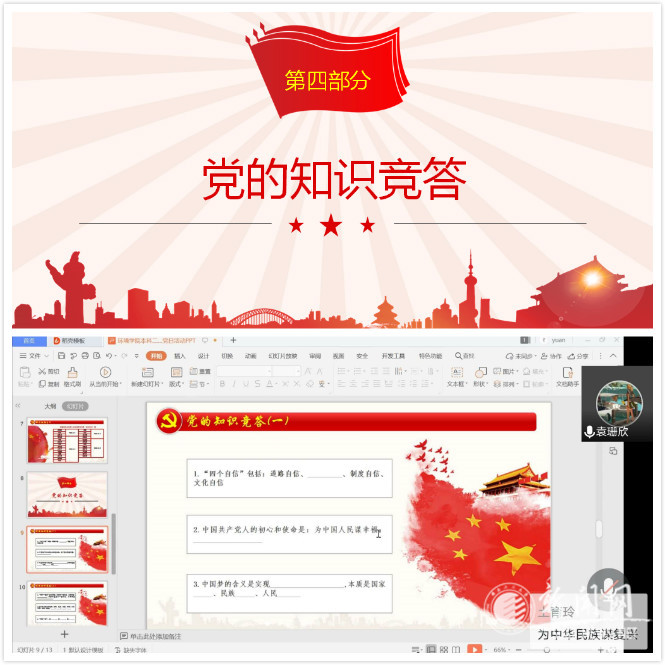 通過分享紅色電影、紅色書籍、黨史知識競賽等,支部黨員重溫紅色經(jīng)典,從歷史中汲取理想信念給養(yǎng),傳承紅色基因,筑牢信仰之基。本科第二黨支部通過《永不消逝的電波》、《湄公河行動》、《我和我的祖國》、《紅海行動》等觀影分享,引發(fā)支部成員熱烈討論;本科第一黨支部通過“三個一”分享會,即“分享一部紅色電影、介紹一本紅色書籍、講一個紅色故事”,引領(lǐng)支部黨員激發(fā)愛黨愛國熱情;研究生第一黨支部則通過黨史知識競賽,通過留言的方式在騰訊會議進行評論搶答,以賽促學,切實提高黨員黨性修養(yǎng)。