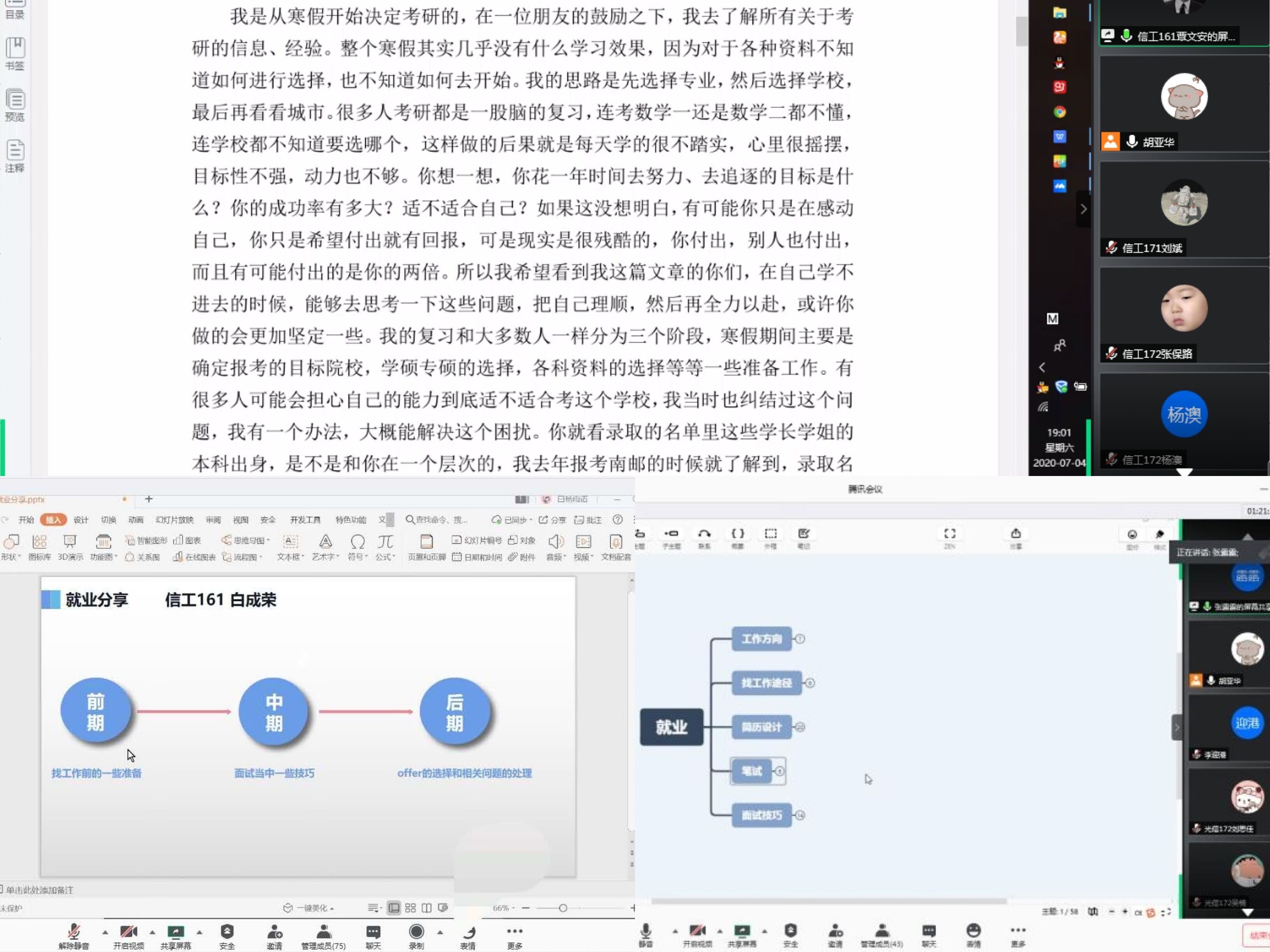 組織考研就業(yè)經(jīng)驗交流,薪火相傳。7月3日至4日,各黨支部聯(lián)合2017年級組在線上開展了“傳幫帶—考研就業(yè)經(jīng)驗交流會”主題黨日活動?;顒友埩藖碜援厴I(yè)年級的黨員代表、保研至我校的尚佳童同學,經(jīng)歷考研失利后成功簽約京東方的黨員代表李文博同學等一批在在考研和就業(yè)方面比較突出的畢業(yè)生分享了相關經(jīng)驗。17級學生紛紛表示,此次特殊的黨日活動,給了自己很大的啟發(fā),讓他們對未來有了更清晰的規(guī)劃。