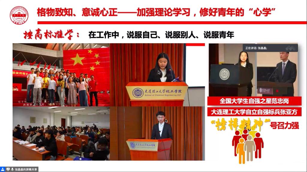 張晶晶結(jié)合共青團(tuán)工作改革的思路與做法以及青年人如何開展理論學(xué)習(xí)兩項重點內(nèi)容,聯(lián)系大連理工大學(xué)的實際情況,向參會學(xué)員分享了“青馬工程”,“實驗室開放日”等品牌團(tuán)學(xué)活動的開展情況與育人效果,用實際案例對青年團(tuán)員寄予了“格物致知、意誠心正”、“日新而進(jìn)、精進(jìn)永固”的殷切期望。學(xué)員們認(rèn)真聽講、積極互動,對授課內(nèi)容產(chǎn)生了強(qiáng)烈共鳴。