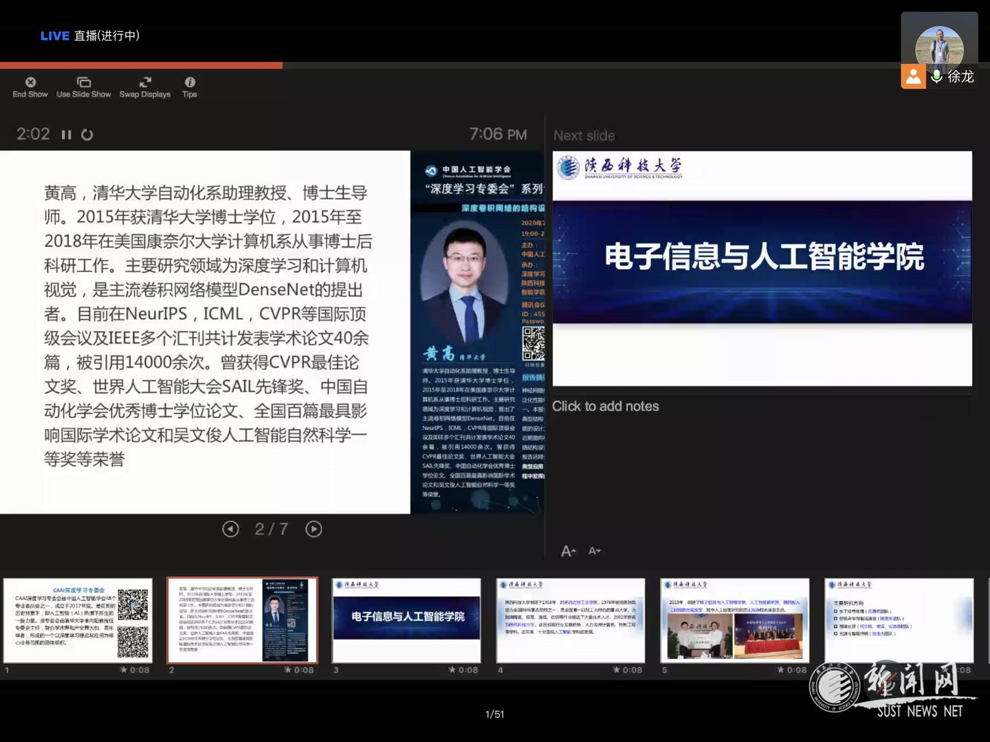 為推動(dòng)深度學(xué)習(xí)研究及應(yīng)用,中國(guó)人工智能學(xué)會(huì)(CAAI)深度學(xué)習(xí)專委會(huì)主辦“深度學(xué)習(xí)專委會(huì)云論壇”系列活動(dòng)。我校電智學(xué)院及人工智能研究院應(yīng)邀承辦“深度學(xué)習(xí)專委會(huì)云論壇”7月17日晚舉辦的首期論壇,邀請(qǐng)清華大學(xué)黃高助理教授做題為“深度卷積網(wǎng)絡(luò)的結(jié)構(gòu)設(shè)計(jì)(Deep Convolutional Network Architectures)”的前沿科學(xué)報(bào)告。電智學(xué)院教師及部分研究生參加了在線學(xué)術(shù)論壇。