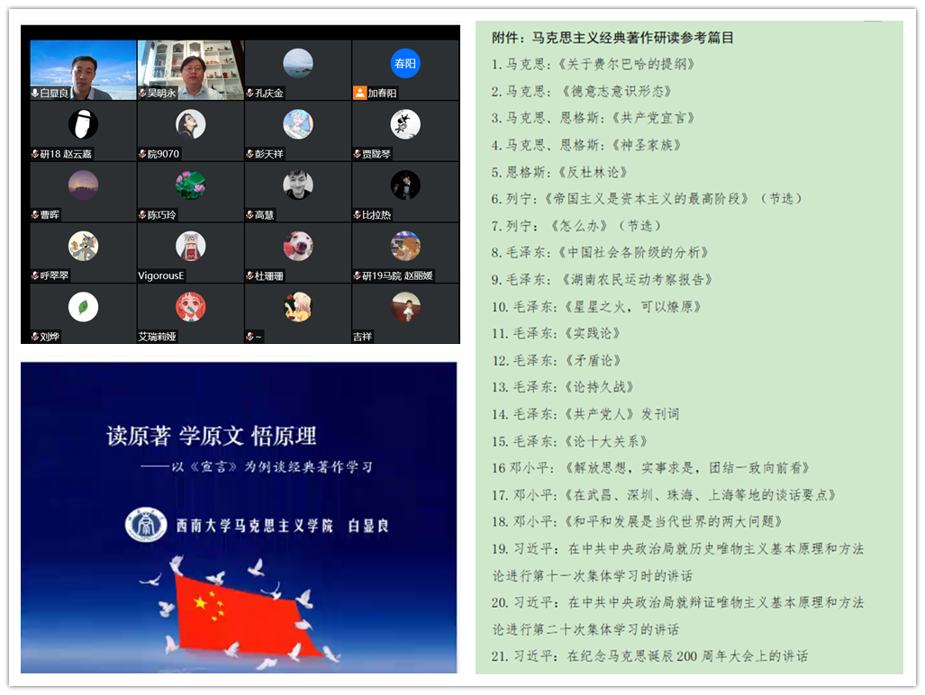 啟動(dòng)會(huì)上,西南大學(xué)馬克思主義學(xué)院院長(zhǎng)白顯良教授,受邀通過云端平臺(tái)為我院師生作了題為《讀原著學(xué)原文悟原理——以〈宣言〉為例談經(jīng)典著作學(xué)習(xí)》的“經(jīng)典著作導(dǎo)讀”專題講座。白顯良教授首先從“為什么讀”“怎么讀”馬克思主義經(jīng)典著作兩個(gè)問題切入,進(jìn)行答疑解惑,之后,以《共產(chǎn)黨宣言》為例,從這是一部什么樣的書、主要講了什么內(nèi)容、為什么今天還要學(xué)、應(yīng)該如何學(xué)習(xí)研讀等四個(gè)方面,就如何進(jìn)行馬克思主義經(jīng)典著作研讀,進(jìn)行了精彩紛呈的講解。他認(rèn)為,經(jīng)典著作猶如陳壇老酒,需要慢慢品味,具有歷久彌新的永恒魅力。通過聆聽報(bào)告,與會(huì)師生不僅感受到《共產(chǎn)黨宣言》所飽含的思想魅力和真理力量,更加深了對(duì)研讀經(jīng)典著作重要性的理解和認(rèn)識(shí)。
