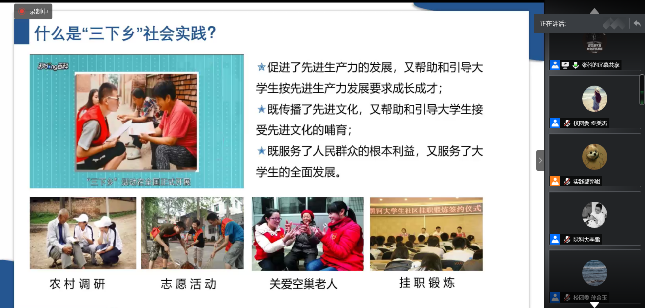 培訓(xùn)會(huì)共四項(xiàng)議程:首先校團(tuán)委書記李鵬宣讀了《2020年陜西科技大學(xué)大學(xué)生志愿者暑期文化科技衛(wèi)生“三下鄉(xiāng)”社會(huì)實(shí)踐活動(dòng)團(tuán)隊(duì)報(bào)備名單》。其次西安交通大學(xué)第一附屬醫(yī)院感染控制辦公室主任技師李寶珍教授進(jìn)行了題為“常態(tài)化疫情防控如何做好自身防護(hù)”的講座,李寶珍從疫情防控常態(tài)化面臨的問題入手,逐步深入,系統(tǒng)全面的為我們分享了如何做好自身防護(hù)的知識和技能。隨后,材料科學(xué)與工程學(xué)院團(tuán)委書記張科應(yīng)邀為全體實(shí)踐團(tuán)隊(duì)成員進(jìn)行了暑期社會(huì)實(shí)踐調(diào)研工作輔導(dǎo)報(bào)告,向全體社會(huì)實(shí)踐隊(duì)成員和帶隊(duì)老師系統(tǒng)講授了如何開展社會(huì)實(shí)踐活動(dòng)、科學(xué)調(diào)研方法及調(diào)研報(bào)告的規(guī)范與要求。此外,校團(tuán)委協(xié)同陜西科技大學(xué)易班工作站運(yùn)用易班網(wǎng)上平臺(tái)開展線上社會(huì)實(shí)踐活動(dòng)。易班工作站郭凡幀從易班優(yōu)課的建立、使用等方面進(jìn)行了易班操作指南的詳細(xì)講解。最后校團(tuán)委書記李鵬進(jìn)行總結(jié)講話:希望各實(shí)踐團(tuán)隊(duì)及個(gè)人在今年暑期的實(shí)踐征程中牢記使命,砥礪奮斗,堅(jiān)守安全底線,沖擊貢獻(xiàn)的高線,用好新工具,以實(shí)際行動(dòng)助力精準(zhǔn)扶貧,在全面建成小康社會(huì)的決勝之年,以優(yōu)異的成績展現(xiàn)新時(shí)代科大學(xué)子的青春風(fēng)采。