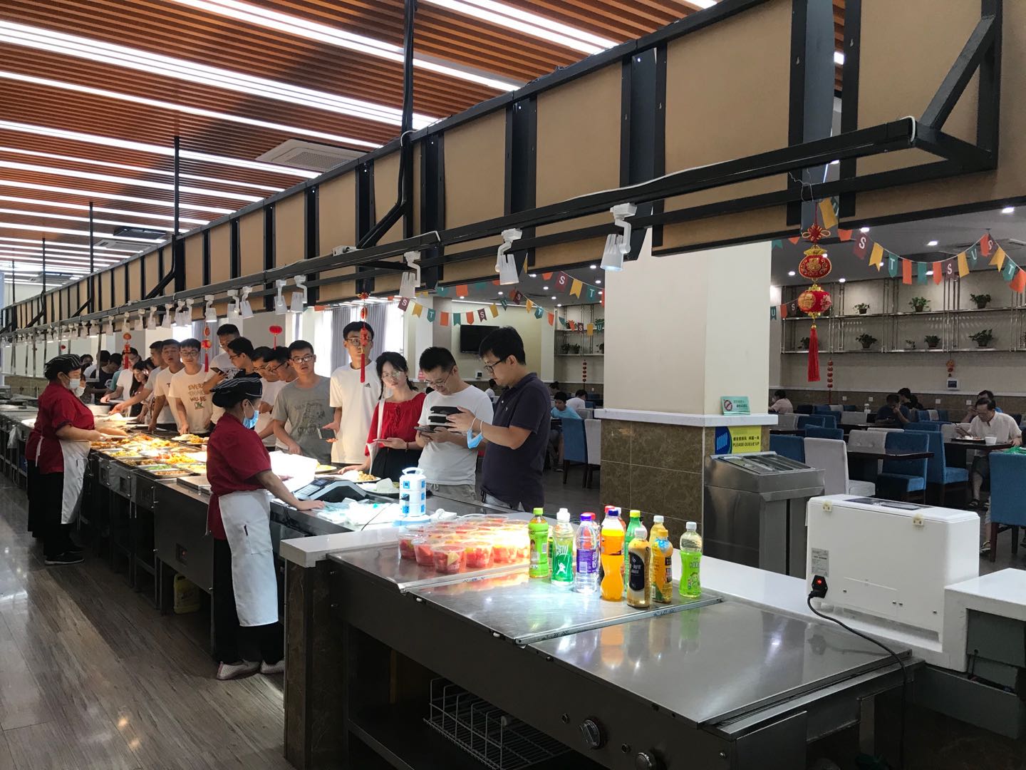 暑假天氣溽熱,校園餐飲服務卻不打折扣,飲食服務中心為保障數千名留校師生的餐飲需求,由馨園餐廳精心備餐、熱情服務,馨園一層風味餐廳17個檔口全部營業(yè),二樓自助餐廳周一到周日每日菜品不重樣,一日三餐為師生供應營養(yǎng)健康、口味豐富的餐品。