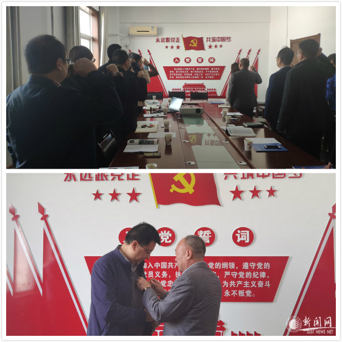 匯報交流之后,雙方人員在黨旗下宣誓,電控學院黨委書記喬明哲代表碩博共建黨支部與合容電氣股份有限公司黨支部書記王永斌互換黨徽。