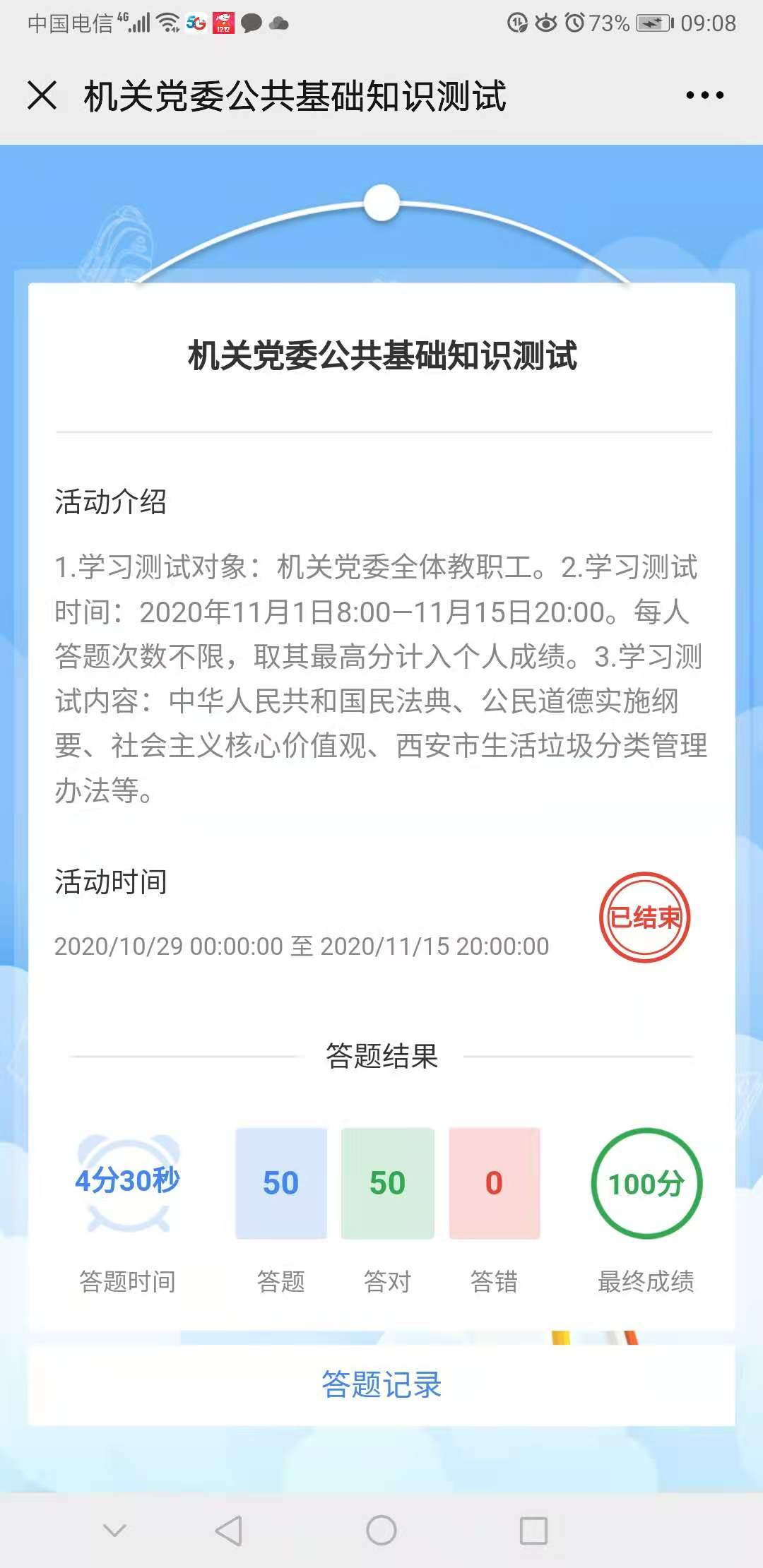 為切實(shí)提升機(jī)關(guān)服務(wù)理念,提高工作效率,創(chuàng)建學(xué)習(xí)型機(jī)關(guān),加強(qiáng)機(jī)關(guān)教職工公共知識(shí)的學(xué)習(xí),根據(jù)《陜西科技大學(xué)教職工政治理論學(xué)習(xí)制度(試行)》,11月1至15日,機(jī)關(guān)黨委在機(jī)關(guān)范圍內(nèi)進(jìn)行了公共基礎(chǔ)知識(shí)測試活動(dòng)。