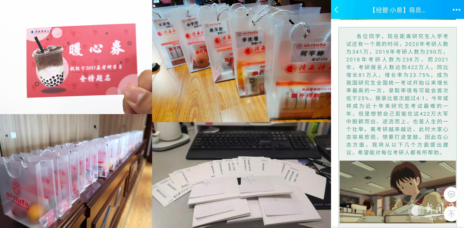 會后,所有老師為考研學(xué)子送上“考研暖心大禮包”。禮包中的一份蘋果寓意“蘋”安順利,一份臍橙寓意馬到“橙”功,一張陽光茶飲券寓意考研之途春暖花開、旗開得勝,一套得力文具寓意考研學(xué)子文思泉涌、考場“得力”,一張輔導(dǎo)員老師們親手寫的“考研加油”卡,寓意所有考研學(xué)子能夠乘風(fēng)破浪、堅毅前行。同學(xué)們紛紛表示作為經(jīng)管學(xué)子,真切感受到了學(xué)院及老師們家一般的關(guān)愛與支持,在最后的考研沖刺階段定會全力以赴、勝利凱旋。