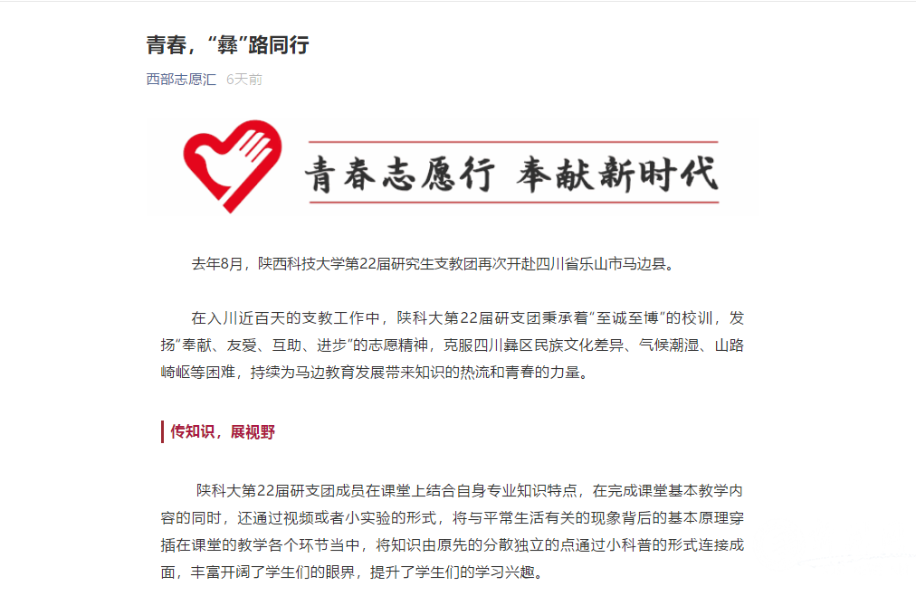 近日,全國西部計(jì)劃項(xiàng)目辦以“青春,‘彝’路同行”為題在其官方平臺(tái)“西部志愿匯”專題報(bào)道了我校第22屆研究生支教團(tuán)事跡。第22屆研究生支教團(tuán)由七名同學(xué)組成,在四川省馬邊彝族支教期間,堅(jiān)持以黨建引領(lǐng)支教工作,聚焦扶志扶智育人,切實(shí)踐行志愿服務(wù)精神,全身心投入彝區(qū)教學(xué)和社會(huì)調(diào)研等工作,為馬邊打贏脫貧攻堅(jiān)戰(zhàn)、鞏固拓展控輟保學(xué)成果、提升鄉(xiāng)村教育質(zhì)量提供了有力支持、作出了科大貢獻(xiàn)。陜西科技大學(xué)研支團(tuán)也榮獲由馬邊縣委縣政府共同頒發(fā)的“2020年全縣脫貧攻堅(jiān)奉獻(xiàn)獎(jiǎng)”。