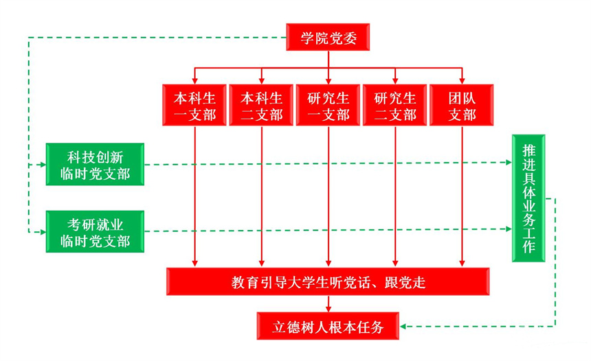 學(xué)院黨委積極構(gòu)建縱橫結(jié)合的黨建矩陣,縱向以黨支部為抓手,進(jìn)行黨建工作的垂直業(yè)務(wù)指導(dǎo),教育引導(dǎo)大學(xué)生堅(jiān)決聽黨話跟黨走;橫向借鑒事業(yè)部制管理模式,依托考研就業(yè)、科技創(chuàng)新等具體工作成立臨時(shí)黨支部,形成黨建工作與業(yè)務(wù)工作推進(jìn)相結(jié)合的組織矩陣,以高質(zhì)量黨建引領(lǐng)高質(zhì)量發(fā)展。