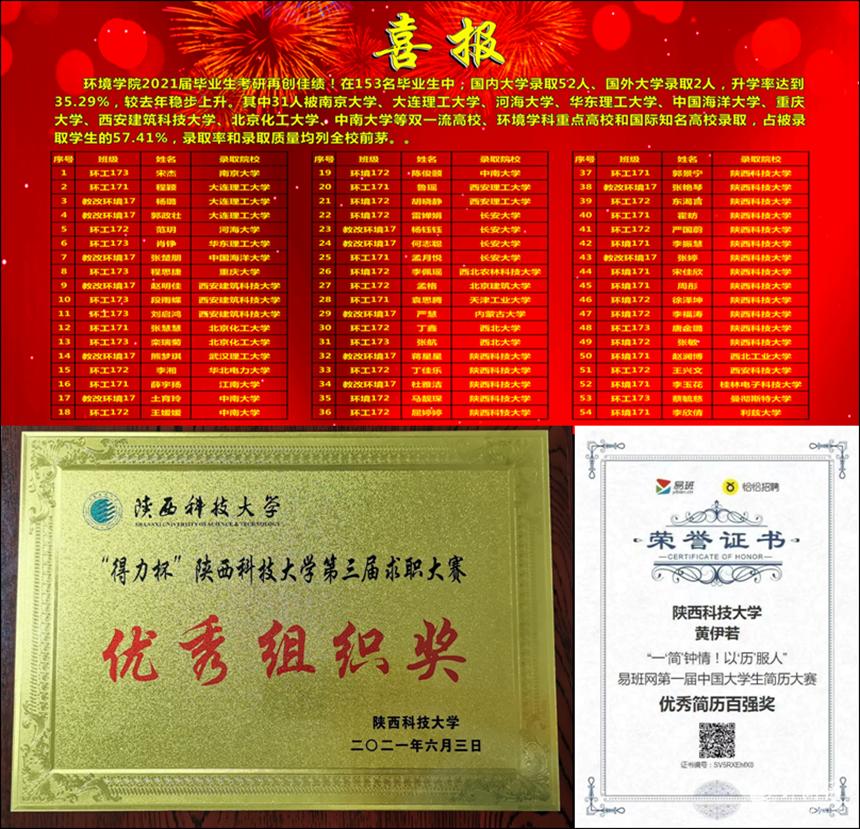 為破解“考研率、就業(yè)質(zhì)量與學(xué)院發(fā)展定位不相稱”難題,學(xué)院黨委成立“考研就業(yè)臨時(shí)黨支部”,找準(zhǔn)工作“小切口”,在為人民服務(wù)最前沿“解難題”,開展“考研黨員一幫一”活動(dòng),通過經(jīng)驗(yàn)介紹、課程輔導(dǎo)、目標(biāo)院校選擇輔導(dǎo)等對(duì)考研學(xué)生進(jìn)行“一幫一”指導(dǎo),2021屆畢業(yè)生中考研報(bào)名率65.4%、考研上線率41.8%、考研錄取率35.3%,均創(chuàng)學(xué)院歷史新高,31名學(xué)生被南京大學(xué)、大連理工大學(xué)、中國(guó)海洋大學(xué)等“雙一流”高校或教育部學(xué)科評(píng)估環(huán)境科學(xué)與工程學(xué)科“B”以上高校錄??;開展“就業(yè)黨員一幫一”活動(dòng),通過生涯規(guī)劃指導(dǎo)、簡(jiǎn)歷制作指導(dǎo)、面試技巧指導(dǎo)等對(duì)畢業(yè)生進(jìn)行“一幫一”指導(dǎo),在易班網(wǎng)第一屆中國(guó)大學(xué)生簡(jiǎn)歷大賽中,黨員黃伊若榮獲 “優(yōu)秀簡(jiǎn)歷百?gòu)?qiáng)獎(jiǎng)”;在“得力杯”陜西科技大學(xué)第三屆求職大賽中,黨員孫于清榮獲三等獎(jiǎng)、黨員黃伊若榮獲人氣獎(jiǎng)、環(huán)境學(xué)院榮獲優(yōu)秀組織獎(jiǎng)。30余名優(yōu)秀畢業(yè)生前往國(guó)家能源集團(tuán)、中海集團(tuán)、中國(guó)石化、中國(guó)葛洲壩集團(tuán)、中國(guó)電建集團(tuán)等知名企業(yè)就業(yè),畢業(yè)生就業(yè)質(zhì)量明顯提升。