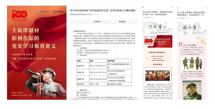 立足專業(yè)特點,創(chuàng)新教育形式。持續(xù)開展“藝術(shù)里的黨史”系列活動,依托學院藝術(shù)類專業(yè)特色,開展了一批與藝術(shù)專業(yè)教育緊密相關的黨史學習教育主題活動。影視藝術(shù)類專業(yè)黨員發(fā)揮影視藝術(shù)學習專長,開展了“百部影評記述百年黨史、百秒視頻陳說祖國輝煌、百張圖片展現(xiàn)錦繡山河”的“三百”系列活動,每日在微信平臺進行推送,影響力持續(xù)擴大。設計類專業(yè)黨員發(fā)揮設計學習專長,與陜西省高校網(wǎng)絡思想政治工作中心聯(lián)合開展“百年恰是風華正茂”藝術(shù)作品設計大賽,積極進行紅色文藝作品創(chuàng)作。