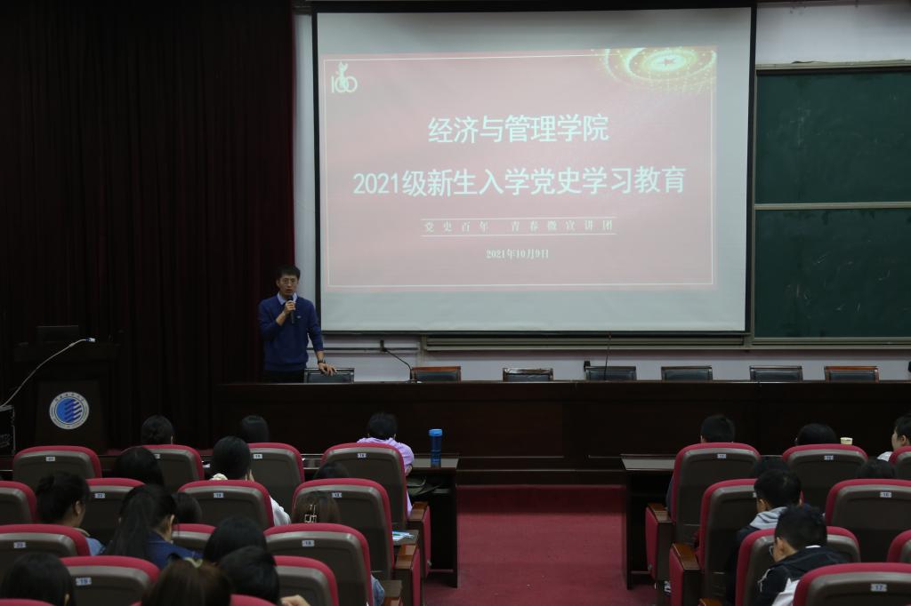 為引導(dǎo)2021級(jí)新生厚植愛黨愛國(guó)情懷,從百年黨史中汲取奮進(jìn)動(dòng)力,做有志氣、有骨氣、有底氣的新時(shí)代青年,經(jīng)濟(jì)與管理學(xué)院積極將黨史學(xué)習(xí)教育有機(jī)融入2021級(jí)新生入學(xué)教育全過程。10月9日上午,經(jīng)管學(xué)院邀請(qǐng)陜西科技大學(xué)“紅色基因·薪火傳承”黨史學(xué)習(xí)教育研究生宣講團(tuán)為學(xué)院2021級(jí)新生作黨史學(xué)習(xí)教育專題宣講報(bào)告。