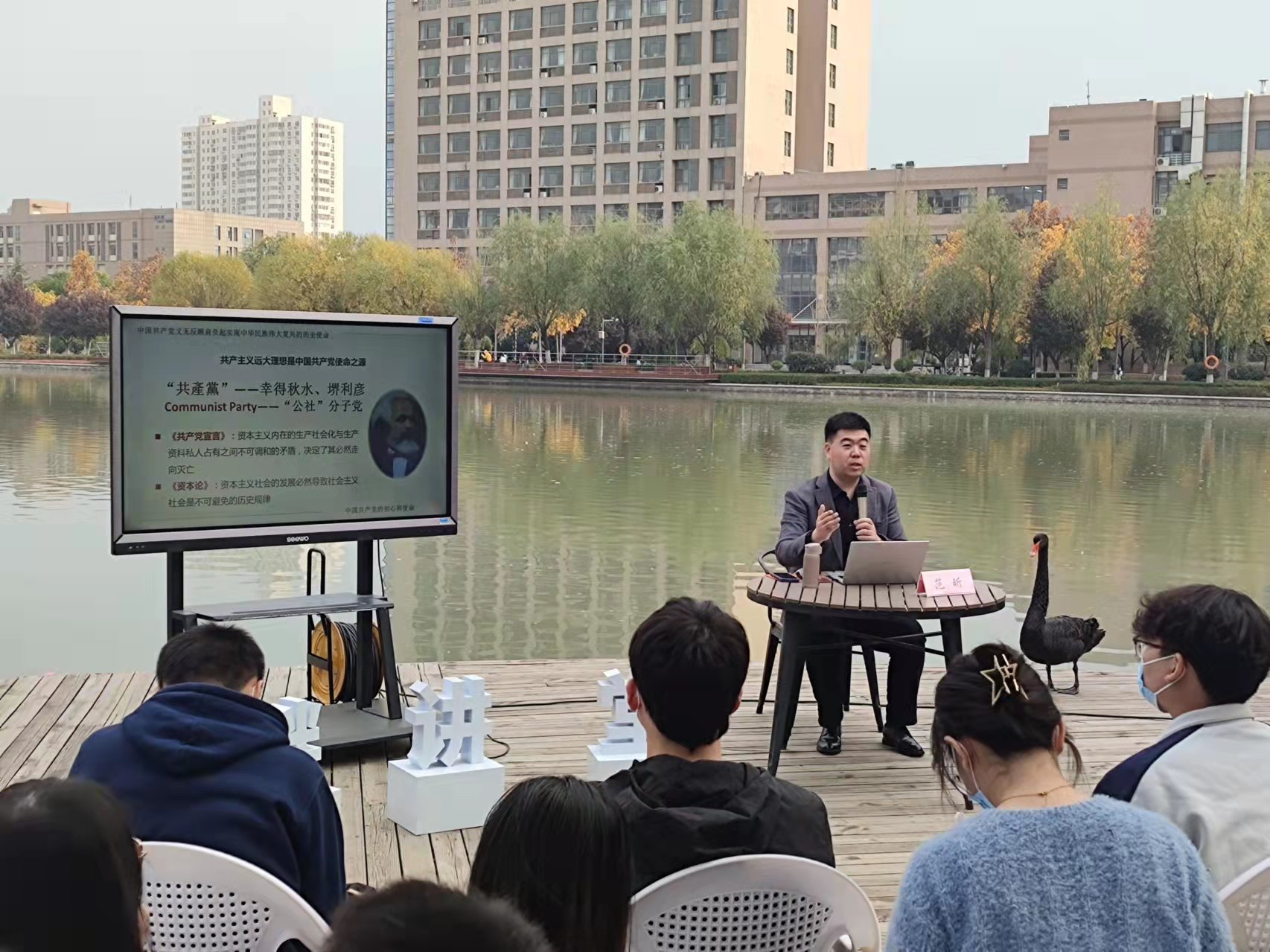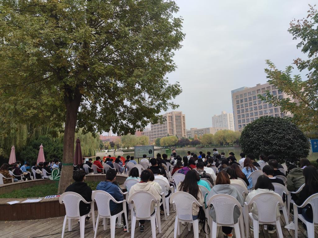 秋日的科大湖畔,層林盡染,碧波蕩漾,材料學(xué)院“湖畔講堂”也在10月31日的下午如約而至。馬克思主義學(xué)院“思想道德與法治”教研部主任、陜西省思政課大練兵教學(xué)骨干范昕受邀做客“湖畔講堂”,在風(fēng)景如畫的湖邊與材料學(xué)院90余名師生交流 “初心”與“核心”話題,引導(dǎo)同學(xué)們追求真理、堅(jiān)定信仰,砥礪前行。