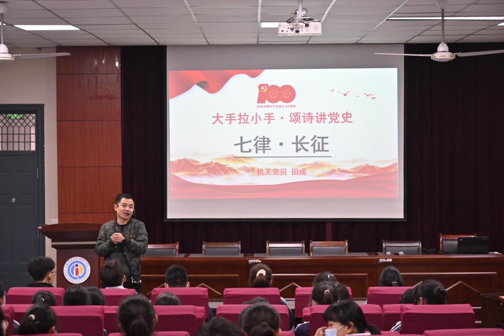 以史鑒今、資政育人。附中積極拓展黨史學(xué)習(xí)教育路徑,持續(xù)開(kāi)展“大手拉小手”系列活動(dòng),通過(guò)打造“紅色宣講課堂”“國(guó)旗下學(xué)黨史”等特色活動(dòng),將黨史知識(shí)融入教育教學(xué),讓紅色基因和革命薪火代代傳承。