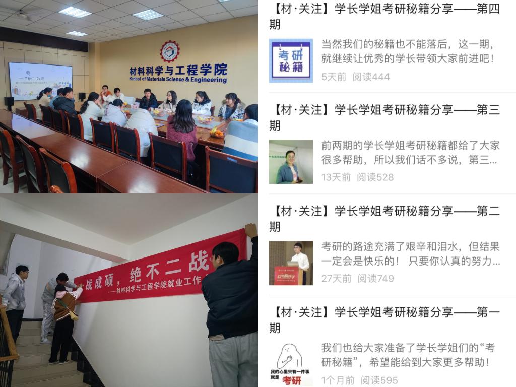 聚焦工作思路,著力提升就業(yè)工作高度。材料學(xué)院切實(shí)提高政治站位,將就業(yè)工作放在人才培養(yǎng)的高度,針對(duì)2022屆本科畢業(yè)生考研報(bào)考率高的現(xiàn)象,進(jìn)一步加強(qiáng)頂層設(shè)計(jì),建章立制,嚴(yán)控落實(shí),注重實(shí)效。一是成立工作小組,明晰工作思路;學(xué)院全面落實(shí)就業(yè)工作“一把手”工程,成立院黨委書記、院長(zhǎng)任組長(zhǎng)的工作領(lǐng)導(dǎo)小組,專題研究確定了“123”的就業(yè)工作思路:即以學(xué)生為主體,發(fā)揮教師和校友兩個(gè)群體作用,確??疾┞?、考研率和就業(yè)落實(shí)率穩(wěn)步提升。二是建立健全機(jī)制,強(qiáng)化服務(wù)保障;學(xué)院修訂了《2022屆畢業(yè)生就業(yè)工作實(shí)施方案》《2022屆畢業(yè)生升學(xué)保障實(shí)施方案》等制度文件,堅(jiān)持制度引領(lǐng),嚴(yán)格落實(shí),確保就業(yè)工作落細(xì)落小落實(shí)。