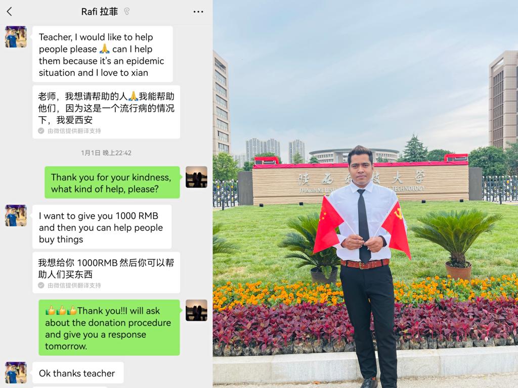 “老師,我想給學(xué)校捐贈(zèng)1000元”,這是一條來(lái)自孟加拉的國(guó)際學(xué)生拉菲(MD RAFIKUL ISLAM)發(fā)給留學(xué)生輔導(dǎo)員的微信消息。1月3日,陜西科技大學(xué)正式收到了拉菲的愛心善款。