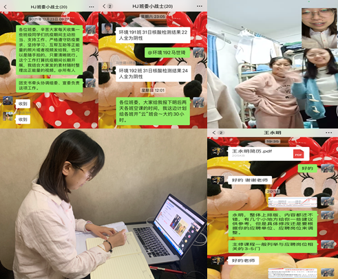 身為一名一線資深輔導(dǎo)員,李丹深知越是疫情防控最吃勁的時候,越要做好學(xué)生的戰(zhàn)“疫”守護(hù)人。雖然所在小區(qū)封閉管理無法到?,F(xiàn)場辦公,但她充分發(fā)揮“云辦公”優(yōu)勢,將“面對面”溝通轉(zhuǎn)化成“屏對屏”交流,利用微信視頻、騰訊會議等召開主題班會及時傳達(dá)學(xué)校疫情防控政策,視頻連線每間宿舍關(guān)注關(guān)心學(xué)生學(xué)習(xí)生活狀態(tài),電話提醒晨午檢打卡、摸排特殊學(xué)生情況、統(tǒng)計核酸檢測數(shù)據(jù),制作黨員志愿者戰(zhàn)“疫”故事短視頻激發(fā)學(xué)生戰(zhàn)勝疫情的決心,開展“環(huán)境19加油站”線上學(xué)習(xí)打卡活動營造勵志上進(jìn)學(xué)習(xí)氛圍,開展線上就業(yè)精準(zhǔn)幫扶一對一指導(dǎo)簡歷修改,這些就是李丹每天在電腦端的工作日常。她用更加耐心的、更加細(xì)致的工作確保學(xué)生教育管理服務(wù)的精準(zhǔn)化、科學(xué)化水平,她用無處不在的“云辦公”告訴學(xué)生“困難來臨的時候我永遠(yuǎn)在你們身邊”。