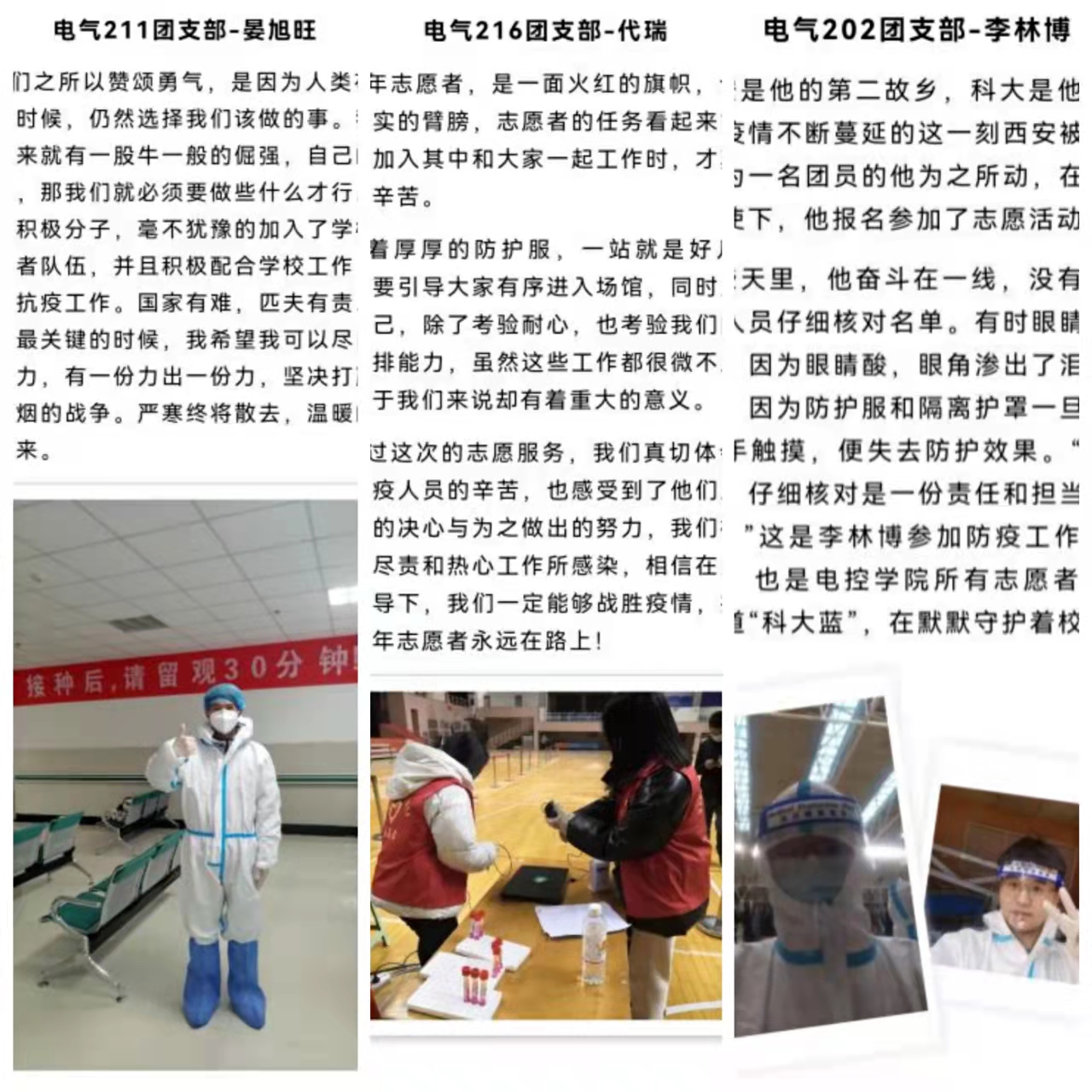 以身作則,志愿奉獻(xiàn)。一是各黨團(tuán)支部以“奮進(jìn)新時代,征戰(zhàn)新征程”為主題開展線上集中學(xué)習(xí)、抗疫志愿服務(wù)、制作抗疫手抄報等系列活動,組織支部黨員錄制“偉大抗疫精神”黨課視頻并積極推送宣傳,引導(dǎo)廣大青年牢記使命擔(dān)當(dāng);二是在疫情形勢最嚴(yán)峻的時刻,電控學(xué)子積極響應(yīng)號召,各支部第一時間組建黨員先鋒隊,讓黨旗高高飄揚(yáng)在防控疫情第一線,并通過“我是黨員我先行”系列推文展示黨員擔(dān)當(dāng);三是50名團(tuán)員自發(fā)組成常備抗疫志愿者隊伍,及時響應(yīng)防疫工作需求。此外,先后225名團(tuán)員志愿者活躍在疫情防控各個崗位上,用實際行動助力抗疫、書寫信念,“電控學(xué)子在行動”欄目集中展示了疫情面前默默奉獻(xiàn)的青年風(fēng)采。