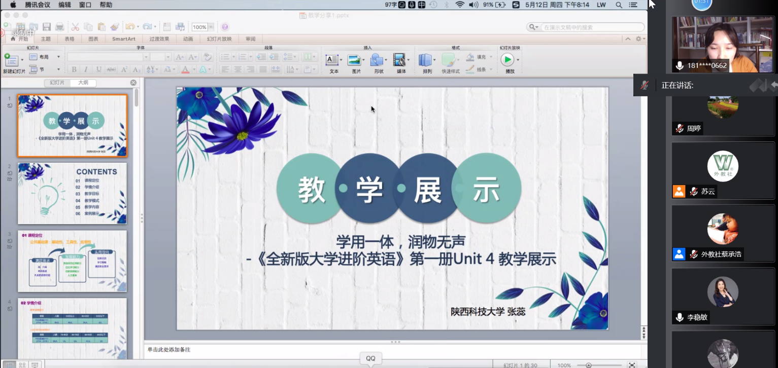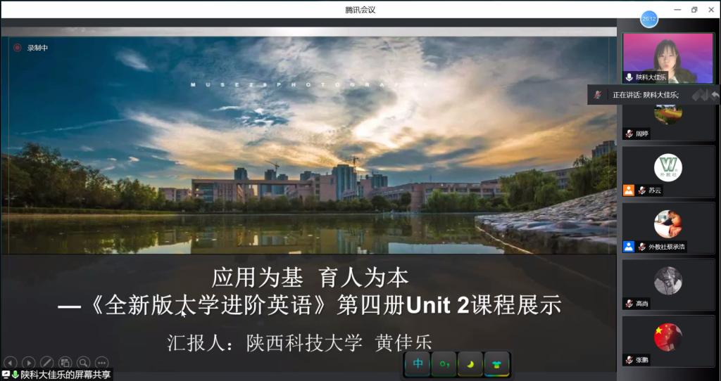 為服務(wù)國家發(fā)展戰(zhàn)略,引領(lǐng)大學(xué)英語教學(xué)改革,助力復(fù)合型國際化人才培養(yǎng),5月12日—27日,上海外語教育出版社與陜西科技大學(xué)、河南建筑職業(yè)技術(shù)學(xué)院、南陽醫(yī)學(xué)高等??茖W(xué)校等高校聯(lián)合開展“探索外語教學(xué)新生態(tài)建設(shè),助力外語課程高質(zhì)量發(fā)展——外教社中西部高校外語課程教學(xué)展示系列講座”。5月12日,首場(chǎng)講座由陜西科技大學(xué)文理學(xué)院副院長李穩(wěn)敏主持,張蕊、黃佳樂兩位青年教師進(jìn)行了教學(xué)展示。
