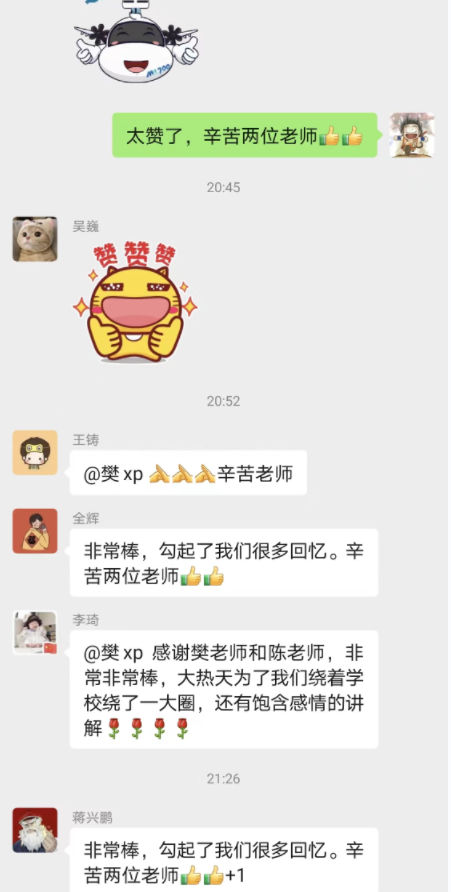 關(guān)心校友、匯聚校友資源、支持校友成長(zhǎng)是學(xué)院一直在努力做的事情,學(xué)院成型教研室樊小蒲、田普建,辦公室陳婭萍3位老師代表學(xué)院對(duì)校友云返?;顒?dòng)表示歡迎,對(duì)長(zhǎng)期以來(lái)校友給予學(xué)院事業(yè)發(fā)展的關(guān)心、支持和幫助表示感謝,并向校友通報(bào)了學(xué)院發(fā)展近況及取得的突出成績(jī),希望校友們通過(guò)此次云返?;顒?dòng)與母校緊密團(tuán)結(jié)起來(lái),期待在疫情過(guò)后與大家緣聚科大,共敘師生情、同窗誼。