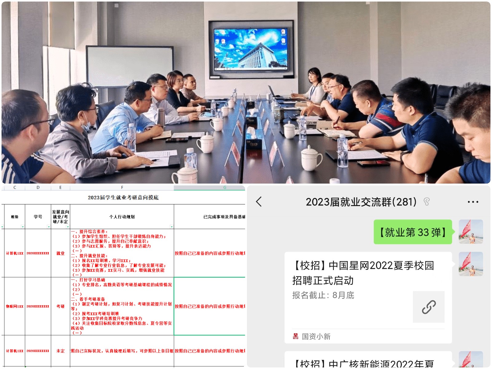 依靠一個“合”字,協(xié)同發(fā)力,搭建頂層設計。電智學院成立2023屆就業(yè)考研工作領導小組,建立書記、院長“雙組長”抓就業(yè)制度,成立6個就業(yè)工作小組,結合各系部主任、專業(yè)負責人、青年博士、輔導員實際,進行專項分工,將就業(yè)實績納入《專任教師公共事務管理及考核辦法》,不斷提升全員參與就業(yè)工作的主動性積極性。工作小組多次召開會議,推進工作落實,召開“電燃夢想,智引未來”2023屆畢業(yè)生考研就業(yè)動員大會,“企業(yè)導師”云聘任大會、考研就業(yè)經(jīng)驗分享會,搭建一盤棋就業(yè)工作格局。