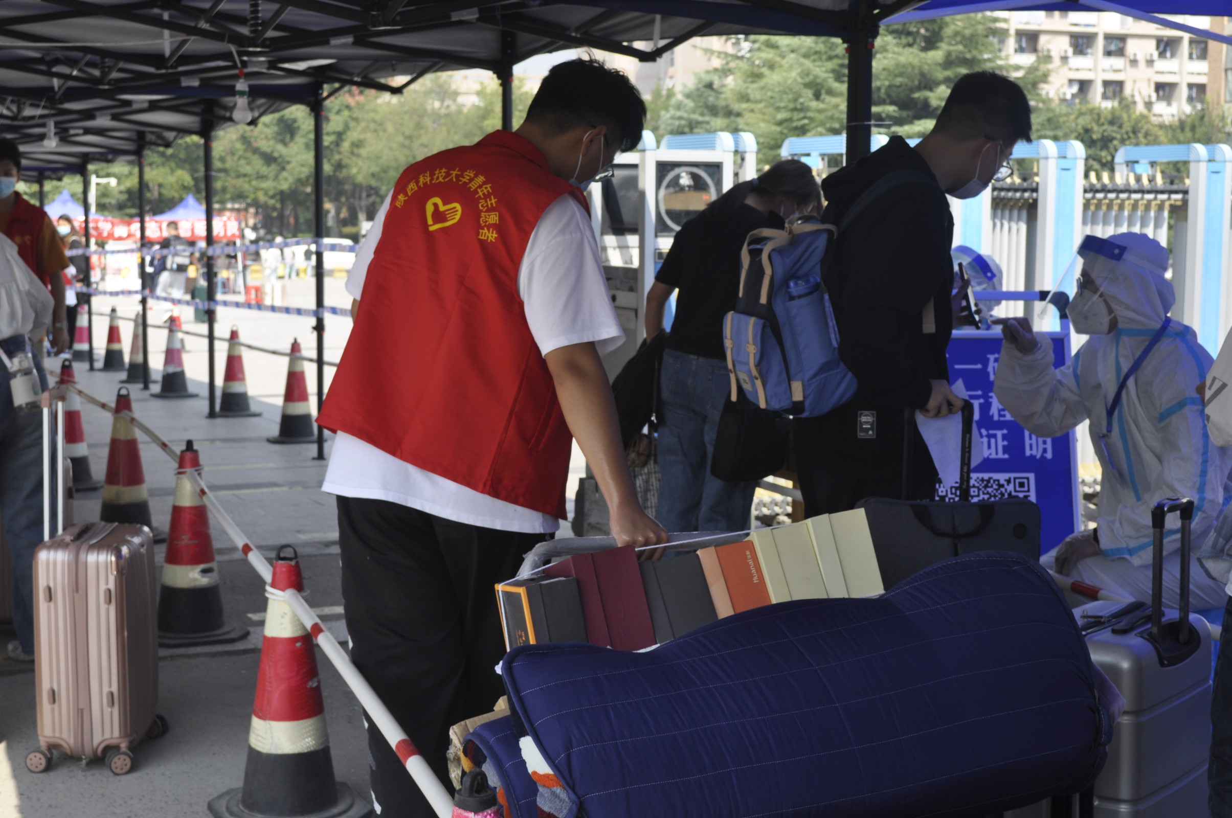 三站輪回閉環(huán)接送,溫暖循環(huán)學(xué)子心間。我校校外志愿服務(wù)崗位主要分為車站外防區(qū)、入校大巴區(qū)、防疫通道內(nèi)部區(qū),三個區(qū)域緊密銜接,依次落實(shí),確保每位學(xué)子安全返校。志愿者們?nèi)淘谛F(tuán)委老師的帶領(lǐng)下,配合學(xué)校有關(guān)職能部門做好接站引路、咨詢解答、體溫監(jiān)測、行李消毒、口罩發(fā)放、搬運(yùn)行李、維持秩序等工作。相較往年的迎新工作,因疫情防控原因,今年志愿者任務(wù)更加艱巨,但在一連串熟悉的動作、一聲聲暖心的問候、一句句耐心的解釋中,無不詮釋了我校志愿者高水平的志愿服務(wù)素養(yǎng)和不怕艱苦、敢打硬仗的精神。