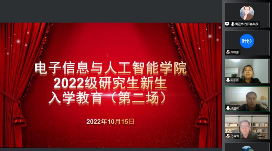 為幫助2022級(jí)研究生新生盡快適應(yīng)研究生階段的學(xué)習(xí)和生活,進(jìn)一步增強(qiáng)對(duì)學(xué)校和學(xué)院的集體歸屬感和學(xué)科專業(yè)的認(rèn)同感,電子信息與人工智能學(xué)院于10月15日晚采用線上會(huì)議的形式組織開展了2022級(jí)研究生新生入學(xué)教育。學(xué)院院長(zhǎng)馬令坤,院長(zhǎng)助理孫連山,研究生導(dǎo)師代表張方輝、周麗麗、李婉,研究生秘書,研究生輔導(dǎo)員以及172名2022級(jí)碩博研究生新生參加此次會(huì)議,會(huì)議由孫連山主持。