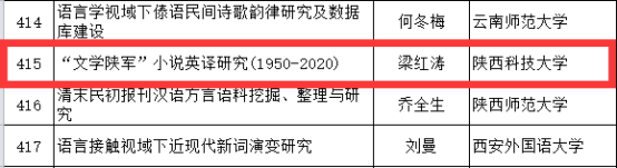 近日,全國哲學(xué)社會科學(xué)工作辦公室公布了2022年國家社科基金項(xiàng)目立項(xiàng)名單,我校文理學(xué)院外語系梁紅濤副教授申請的課題《“文學(xué)陜軍”小說英譯研究(1950-2020)》獲批立項(xiàng),實(shí)現(xiàn)了我校外語系國家級科研項(xiàng)目零的突破,標(biāo)志著外語學(xué)科在翻譯理論與實(shí)踐研究領(lǐng)域邁上新的臺階。