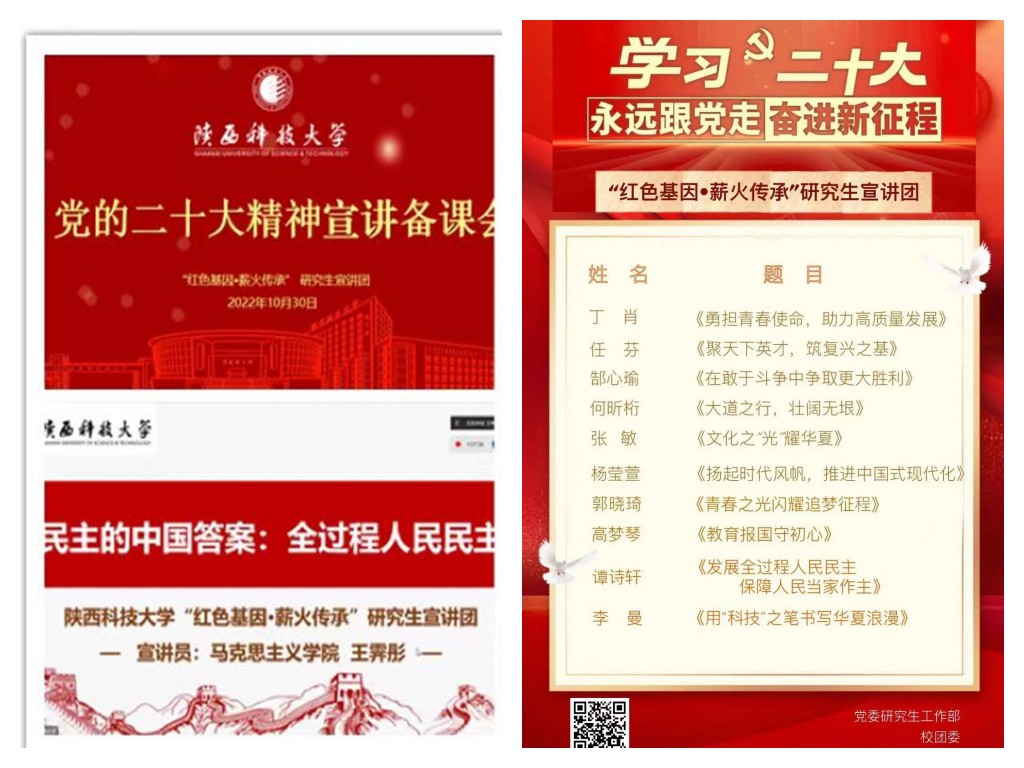 “紅色基因·薪火傳承”研究生宣講團開展黨的二十大精神宣講集體備課會,宣講團成員切實增強學習宣傳貫徹黨的二十大精神的使命感和責任感,圍繞學習貫徹黨的二十大精神,交流學習感悟,分享宣講提綱,開展磨課備課,力爭做到讓青年學生聽得懂、能領(lǐng)會、可落實,把黨的二十大精神宣講好。11月1日,正式推出“學習黨的二十大、永遠跟黨走、奮進新征程”主題微宣講課單(第一期),接受校內(nèi)班級黨團組織預約,以期發(fā)揮朋輩引領(lǐng)作用,用黨的科學理論武裝青年,用黨的初心使命感召青年,帶動全校青年學生迅速掀起學習宣傳貫徹黨的二十大精神的熱潮。