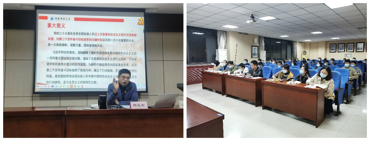 楊長安作題為“學(xué)習(xí)宣傳貫徹‘黨的二十大’精神——做有理想,敢擔(dān)當(dāng),能吃苦,肯奮斗的新時(shí)代好青年”的學(xué)習(xí)分享。一是領(lǐng)學(xué)報(bào)告,領(lǐng)會(huì)精神明方向。他全文領(lǐng)學(xué)了黨的二十大報(bào)告,對報(bào)告蘊(yùn)含的新觀點(diǎn)、新論斷、新思想、新戰(zhàn)略、新要求進(jìn)行了詳細(xì)梳理和解讀,并要求全體學(xué)生原原本本學(xué)習(xí)研讀黨的二十大報(bào)告和《中國共產(chǎn)黨章程》,認(rèn)真領(lǐng)悟黨的二十大提出的新思想新論斷、作出的新部署新要求。二是知所從來,圍繞核心跟黨走。他回顧了習(xí)近平總書記的青春歲月和成長歷程,闡明了習(xí)近平總書記成為全黨領(lǐng)導(dǎo)核心、人民領(lǐng)袖和軍隊(duì)統(tǒng)帥具有堅(jiān)實(shí)的實(shí)踐基礎(chǔ)和深厚的群眾基礎(chǔ)。他提到,核心就是力量,旗幟就是方向,全力推動(dòng)黨的二十大精神在學(xué)院各項(xiàng)工作中落地生根,最根本的就是擁護(hù)“兩個(gè)確立”,堅(jiān)決做到“兩個(gè)維護(hù)”。三是堅(jiān)定信念,爭做時(shí)代好青年。他講述了多個(gè)習(xí)近平總書記同青年交往的故事,帶領(lǐng)大家從“為青年學(xué)生指明奮斗的‘時(shí)間表’”到“青年‘立大志、明大德、成大才、擔(dān)大任’”,重溫習(xí)近平總書記對廣大青年學(xué)子的關(guān)心和鞭策,勉勵(lì)同學(xué)們要在最好的時(shí)代里堅(jiān)定理想信念,立志成為有理想、敢擔(dān)當(dāng)、能吃苦、肯奮斗的新時(shí)代好青年。
