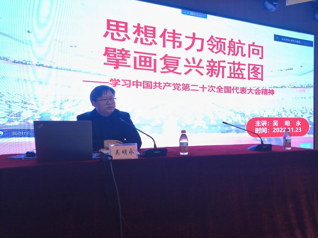 吳明永從“簡(jiǎn)識(shí)黨的二十大-會(huì)議及報(bào)告要點(diǎn)解讀、奮進(jìn)新時(shí)代-過(guò)去五年的工作和新時(shí)代十年的偉大變革、理論新飛躍-開(kāi)辟馬克思主義中國(guó)化時(shí)代化新境界、擘畫新藍(lán)圖-以中國(guó)式現(xiàn)代化全面推進(jìn)中華民族偉大復(fù)興、啟航新征程-為全面建設(shè)社會(huì)主義現(xiàn)代化國(guó)家而團(tuán)結(jié)奮斗”五個(gè)方面對(duì)黨的二十大精神進(jìn)行了系統(tǒng)宣講和闡釋。他號(hào)召大家要更加緊密地團(tuán)結(jié)在以習(xí)近平同志為核心的黨中央周圍,全面貫徹習(xí)近平新時(shí)代中國(guó)特色社會(huì)主義思想,牢記空談?wù)`國(guó)、實(shí)干興邦,堅(jiān)定信心、同心同德,埋頭苦干、奮勇前進(jìn),為全面建設(shè)社會(huì)主義現(xiàn)代化國(guó)家、全面推進(jìn)中華民族偉大復(fù)興而團(tuán)結(jié)奮斗。