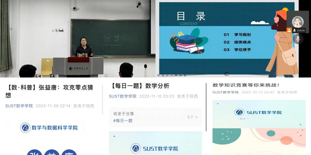 強化專業(yè)教育,描繪成長成才“導(dǎo)航圖”。學(xué)院高度重視新生專業(yè)教育,幫助新生認識所學(xué)專業(yè),培養(yǎng)專業(yè)興趣,增強專業(yè)認同,引導(dǎo)學(xué)生邁入專業(yè)學(xué)習(xí)“快車道”。邀請專業(yè)教師、優(yōu)秀在校生等召開專業(yè)介紹會、班主任見面會、學(xué)習(xí)經(jīng)驗分享交流會,學(xué)院公眾號“SUST數(shù)學(xué)學(xué)院”開通“數(shù)·科普”和“每日一題”專欄,舉辦“數(shù)學(xué)專業(yè)知識競賽”等,全方位多角度促進新生認識所學(xué)專業(yè),培養(yǎng)專業(yè)思維,增進專業(yè)認同感,養(yǎng)成良好學(xué)習(xí)習(xí)慣,幫助新生畫好“專業(yè)規(guī)劃圖”。
