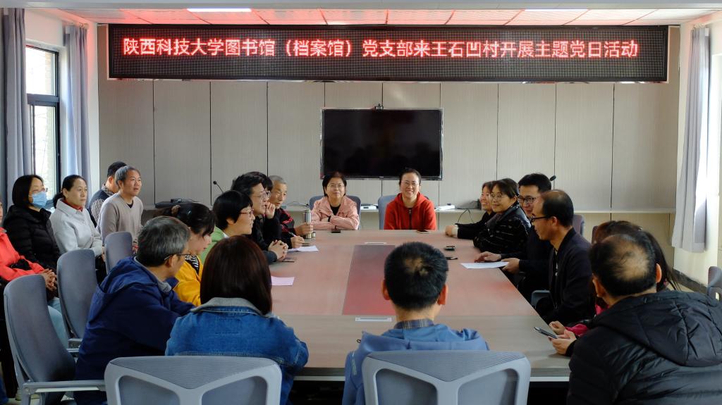 在王石凹村委會,第一書記姜興健首先分享了我校幫扶王石凹村脫貧攻堅的歷程,講述了通過七年的努力如何將一個因老因殘因病致貧的嚴重貧困村蛻變成一個經(jīng)濟產(chǎn)業(yè)特色村的全過程和先進經(jīng)驗。圖書館(檔案館)支部書記鄭勇介紹了支部的總體情況和此次活動的目的意義,副書記趙小羽從支部的五個團隊建設(shè)、制度規(guī)范優(yōu)化、組織生活方式創(chuàng)新、疫情服務(wù)等方面介紹黨建工作與中心工作同步進行的經(jīng)驗和亮點,根據(jù)王石凹村黨員難集中,組織生活開展形式不豐富的問題,提出圖書館可發(fā)揮資源優(yōu)勢,通過線上VR方式開展紅色黨建工作的建議。王海剛從圖書檔案角度出發(fā),提出重點應(yīng)利用圖書館(檔案館)優(yōu)勢,從農(nóng)家書屋著手在精神文化層面推進幫扶成效。