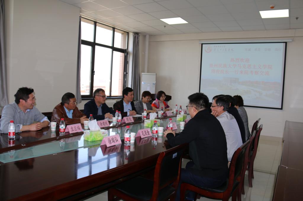 會(huì)上,吳明永就學(xué)校以及馬院的基本情況,特別是近年來(lái)馬院學(xué)科建設(shè)、師資隊(duì)伍、思政課改革等進(jìn)行了全面的介紹。周俊詳細(xì)介紹了貴州民族大學(xué)馬院改革發(fā)展情況,并就人才引進(jìn)進(jìn)行了詳細(xì)說(shuō)明。雙方表示,兩院同為省級(jí)重點(diǎn)馬院,在學(xué)科建設(shè)、思政課改革等方面各具特色優(yōu)勢(shì),希望以此次交流為契機(jī)進(jìn)一步加強(qiáng)合作,共同進(jìn)步。