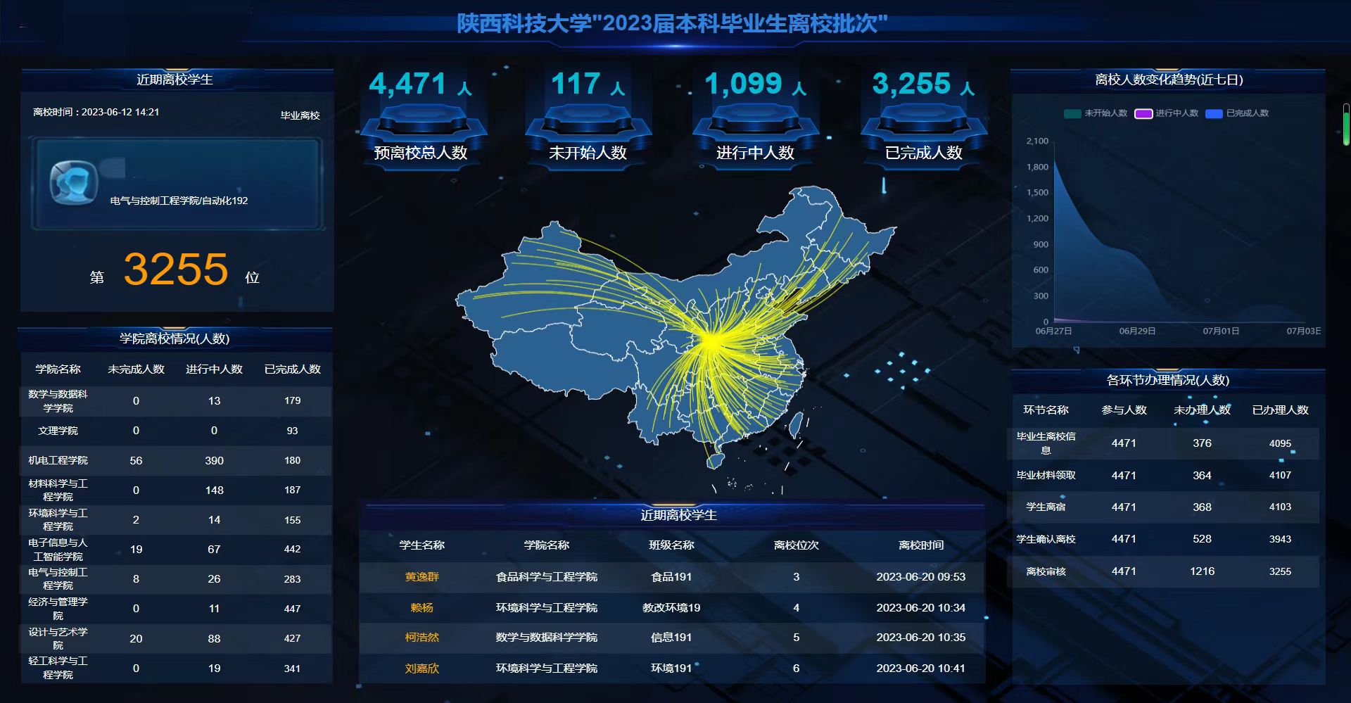 網(wǎng)絡(luò)思政中心會同學(xué)工部,統(tǒng)籌專業(yè)力量,打造上線畢業(yè)生數(shù)字離校應(yīng)用系統(tǒng),實現(xiàn)了基于易班的學(xué)生日常管理系統(tǒng)的再升級。該應(yīng)用包含離校信息統(tǒng)計、畢業(yè)材料領(lǐng)取、離宿辦理、確認(rèn)離校、教師審核等5個環(huán)節(jié),學(xué)生根據(jù)個人安排自主進(jìn)行相應(yīng)業(yè)務(wù)辦理,實現(xiàn)畢業(yè)籌備“一鍵開啟”。離校全程環(huán)環(huán)相扣,實時數(shù)據(jù)動態(tài)更新,管理人員一機在手,即可總攬全局,極大程度提升了工作的便捷化和數(shù)據(jù)化。