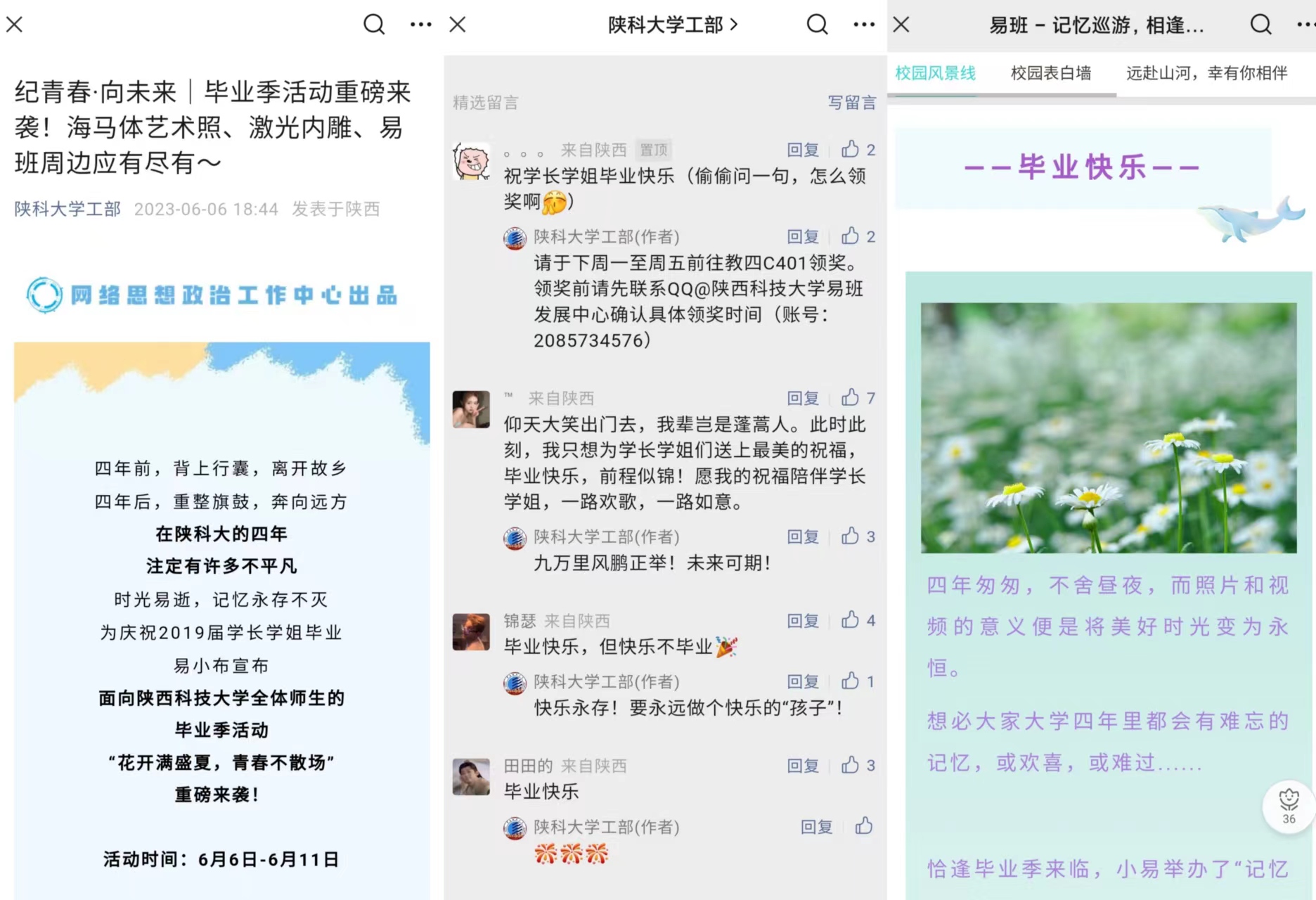 依托易班領(lǐng)銜的“一網(wǎng)兩微多端”全媒體矩陣,打造專欄“紀(jì)青春·向未來”,發(fā)布《紀(jì)青春·向未來|畢業(yè)季活動重磅來襲!海馬體藝術(shù)照、激光內(nèi)雕、易班周邊應(yīng)有盡有~》等原創(chuàng)文章6篇,推出《我為自己畫明天》等短視頻14部,上線“記憶巡游,相逢有期”等輕應(yīng)用快搭9個,累計關(guān)注量達(dá)10W+。