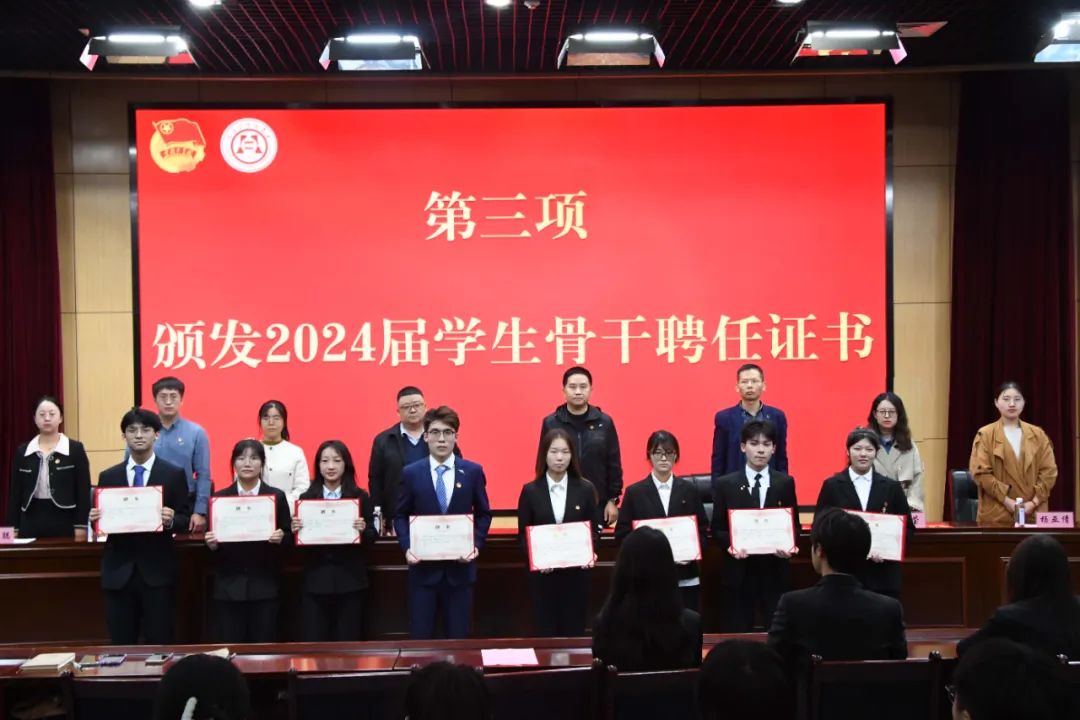 大會(huì)在莊嚴(yán)的團(tuán)歌中拉開(kāi)序幕。學(xué)院團(tuán)委書(shū)記陳強(qiáng)強(qiáng)宣讀《關(guān)于經(jīng)濟(jì)與管理學(xué)2023-2024學(xué)年團(tuán)學(xué)組織學(xué)生干部的任命決定》,與會(huì)老師為2024屆學(xué)生骨干頒發(fā)聘任證書(shū)。