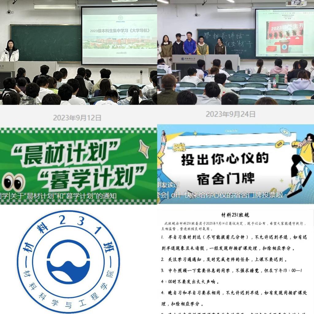 聚焦規(guī)矩意識 強(qiáng)化日常管理。通過新生入學(xué)教育大會,集中學(xué)習(xí)《校長李志健在2023級新生開學(xué)典禮暨軍訓(xùn)動員大會上的講話》《大學(xué)導(dǎo)航》《陜西科技大學(xué)章程》等教育內(nèi)容,幫助新生明確學(xué)校規(guī)章制度,培養(yǎng)新生規(guī)矩意識;2023級新生自進(jìn)入正常教學(xué)周起,全員參與材料學(xué)院晨材計(jì)劃、暮學(xué)計(jì)劃,豐富校園生活,保持學(xué)習(xí)熱情,營造了良好的學(xué)習(xí)氛圍和優(yōu)良學(xué)風(fēng);各班依照《大學(xué)導(dǎo)航》制定《班級規(guī)定》及班級標(biāo)識體系,將個(gè)人行為與集體榮譽(yù)密切集合,建立向上向好向?qū)W班風(fēng);學(xué)院自管會開展宿舍門牌設(shè)計(jì)大賽,創(chuàng)造文明寢室環(huán)境,創(chuàng)建和諧宿舍舍風(fēng);同時(shí)針對日常管理、學(xué)籍管理、活動參與等開展專項(xiàng)教育,引導(dǎo)學(xué)生強(qiáng)化主體意識,激發(fā)自律自省。