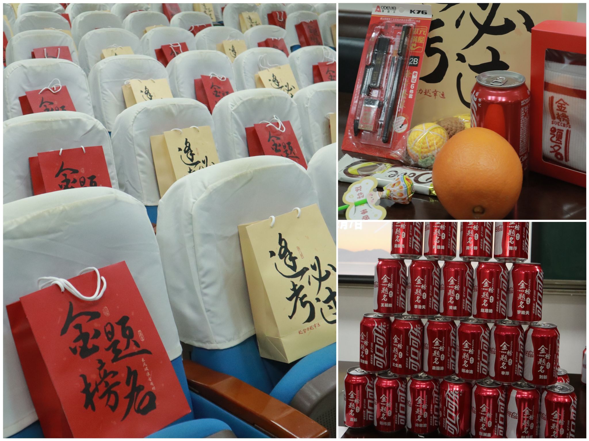隨后,呂斌、張輝共同為學(xué)生送上包含寓意“巧克難題”的巧克力、象征“心想事成”的橙子、印制了“金榜題名”的襪子、定制姓名和祝福語的可樂、寓意“一舉奪魁”的鑰匙扣、考研文具六件套等物品的“暖心加油包”。