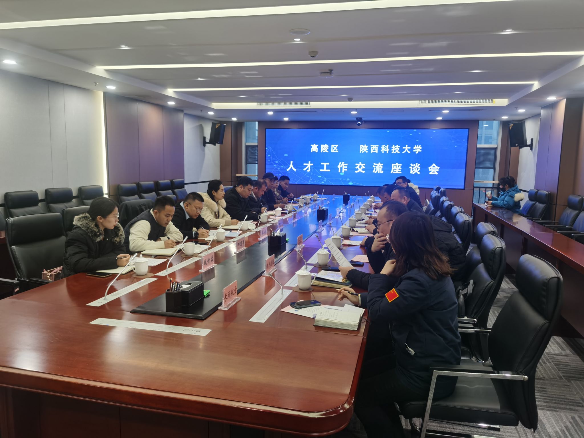 隨后,張凱凱一行與高陵區(qū)委組織部、區(qū)人社局、區(qū)科技工信和商務(wù)局、涇河工業(yè)園管委會(huì)等部門相關(guān)負(fù)責(zé)人以及陜汽控股、吉利汽車、長(zhǎng)羽航空、日新石化、西安工商學(xué)院等5家企業(yè)代表圍繞“校政企”人才合作開展座談交流。會(huì)上,高陵區(qū)人社局副局長(zhǎng)郭超介紹了高陵區(qū)經(jīng)濟(jì)發(fā)展、招才引智政策、就業(yè)見習(xí)及實(shí)習(xí)基地建設(shè)、校企合作和科研成果轉(zhuǎn)化等方面工作開展情況。各用人單位負(fù)責(zé)人相繼圍繞企業(yè)的發(fā)展、主要從事業(yè)務(wù)板塊、人才構(gòu)成、2024年度計(jì)劃招聘情況以及對(duì)學(xué)校在人才培養(yǎng)方面的意見建議進(jìn)行發(fā)言。張凱凱詳細(xì)介紹了我校發(fā)展歷程、辦學(xué)特色、學(xué)科和專業(yè)建設(shè)情況,對(duì)和企業(yè)用人需求相匹配的專業(yè)作出重點(diǎn)推介,指出我校有豐富的學(xué)科專業(yè)資源,可以為企業(yè)提供技術(shù)支撐和人才輸送,希望通過(guò)本次走訪加強(qiáng)校企交流,優(yōu)化學(xué)校人才培養(yǎng)方案,共同譜寫校政企合作共贏新篇章。