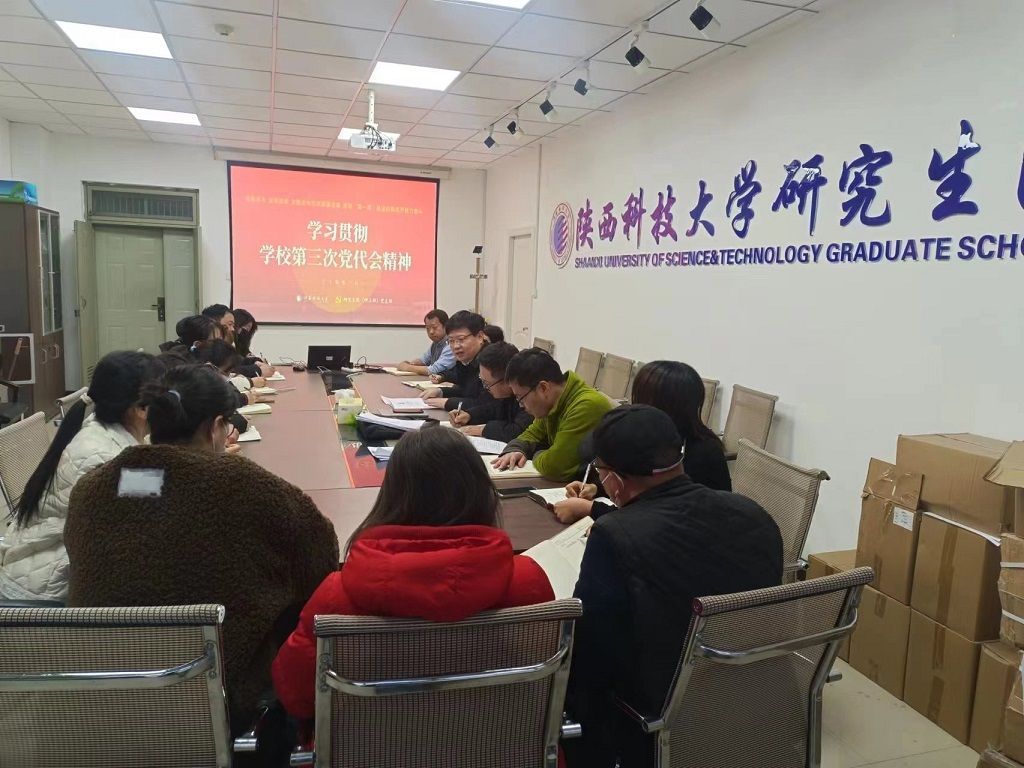 陸趙情結(jié)合會議精神對全院同志提出三點要求:一是要深刻認識學(xué)習(xí)第三次黨代會精神的重要性,把學(xué)習(xí)貫徹黨代會精神與推動實現(xiàn)研究生院年度工作目標(biāo)、《新時代陜西科技大學(xué)研究生教育改革發(fā)展實施方案》、“十四五”事業(yè)發(fā)展規(guī)劃及學(xué)?!皬?fù)興計劃”有機結(jié)合起來,同部署同謀劃同推進。二是聚焦主責(zé)主業(yè),圍繞“十大行動”,以追求卓越研究生教育為目標(biāo),全面實施思政育人鑄魂行動,深化人才培養(yǎng)體制機制改革,搭建高層次創(chuàng)新人才培養(yǎng)平臺,推進“本碩博”貫通式人才培養(yǎng)模式及研究生教育分類發(fā)展,以新作為新氣象推動研究生教育事業(yè)高質(zhì)量發(fā)展取得新成效。三是抓好第三次黨代會精神貫徹落實,全院上下要結(jié)合會議精神認真學(xué)習(xí),采取多種形式開展學(xué)習(xí)宣傳貫徹學(xué)校第三次黨代會精神的活動,并落實到日常學(xué)習(xí)、工作、科研中,做到知行統(tǒng)一。