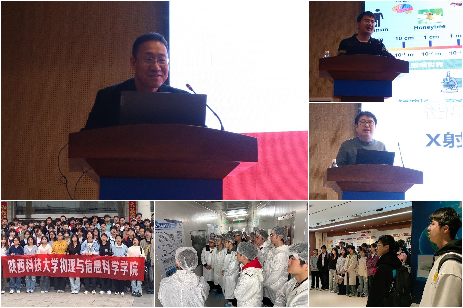 啟動儀式后,科技文化節(jié)舉辦首場講座,邀請物理學院特聘教授、中國科學院西安光學精密機械研究所二級研究員田進壽及其團隊成員作報告。田進壽教授從時代使命、科研隊伍、學科方向及科研成果等方面,詳細介紹了西安光機所的發(fā)展歷史,強調(diào)基礎研究是科技創(chuàng)新的源頭,教育引導學生要增強專業(yè)學習興趣,及時了解學科前沿知識與行業(yè)發(fā)展動態(tài)。隨后,田進壽科研團隊成員羅端研究員、何凱副研究員結(jié)合個人研究方向,分別以《超快電子衍射技術及其應用》《X射線超快診斷技術進展及應用例舉》為題,開展前沿學術講座,并與在場師生進行交流,共同探討科技創(chuàng)新之路,現(xiàn)場氣氛熱烈,師生紛紛表示收獲頗豐。啟動儀式當天,學院還組織學生前往西安光機所參觀了“瞬態(tài)光學與光子技術國家重點實驗室”“中科院超快診斷技術重點實驗室”“中科院西安光學精密機械研究所所史館”。