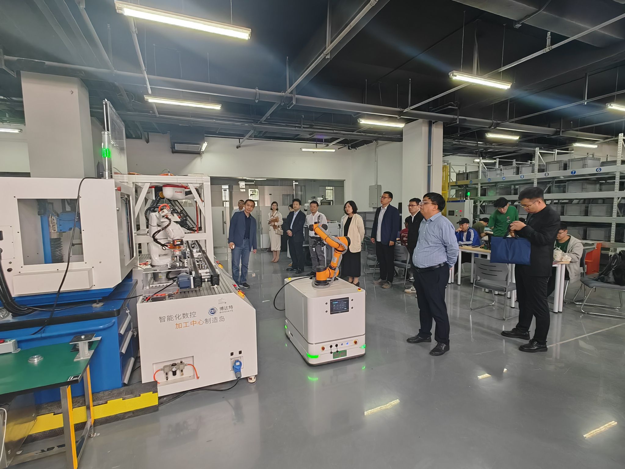 在中瑞GF智能制造創(chuàng)新研究院,考察了智能制造生產(chǎn)線、正在調(diào)試中的五軸加工中心、導(dǎo)軌機(jī)器人,以及智能倉儲(chǔ)穿梭車系統(tǒng)。在智能制造柔性生產(chǎn)線中,具有語音功能的AGV小車自動(dòng)對各加工工位進(jìn)行導(dǎo)覽和講解,MES系統(tǒng)大屏幕能夠自動(dòng)顯示產(chǎn)線運(yùn)行狀態(tài)和生產(chǎn)信息,產(chǎn)線中的機(jī)器人、傳送帶、加工單元有條不紊的工作,展示了現(xiàn)代制造生產(chǎn)線的運(yùn)行狀況。在加工制造區(qū)域,MES系統(tǒng)顯示屏幕顯示兩臺(tái)加工中心的加工信息,地軌機(jī)器人能夠?qū)⒃牧戏湃胍慌_(tái)加工中心加工,并將粗加工的產(chǎn)品取出,放入另一臺(tái)加工中心進(jìn)行精密加工,加工完畢后,將產(chǎn)品取出放入倉位。張琳對機(jī)電學(xué)院在智能制造、柔性生產(chǎn)線方面的研發(fā)條件、實(shí)驗(yàn)環(huán)境表示贊賞,希望學(xué)院能夠利用好這些科研條件,與浐灞國際港達(dá)成深度合作。趙江民就柔性生產(chǎn)線、穿梭車技術(shù)與參加培訓(xùn)的教師、研究生進(jìn)行了交流。