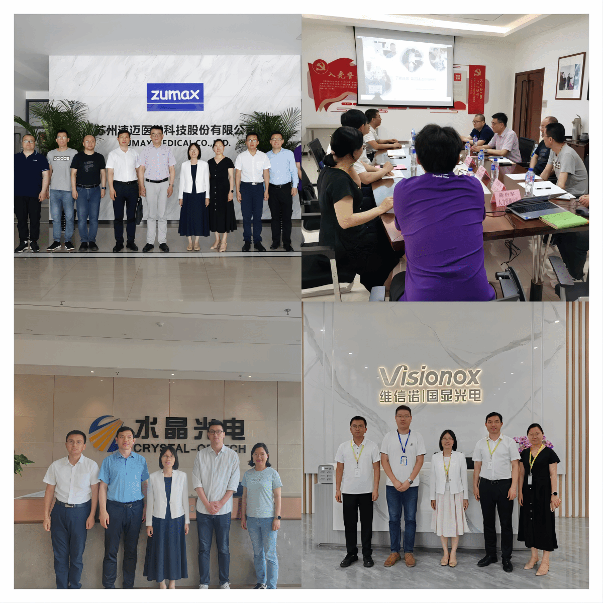 陳源梅一行先后走訪了浙江水晶光電科技股份有限公司、蘇州速邁醫(yī)學(xué)科技股份有限公司、昆山國(guó)顯光電有限公司、昆山龍騰光電股份有限公司。走訪中,院企雙方進(jìn)行了深度座談交流,聽(tīng)取各家企業(yè)對(duì)學(xué)院人才培養(yǎng)、專業(yè)建設(shè)方面的意見(jiàn)和建議,了解企業(yè)用人需求,邀請(qǐng)企業(yè)更多參與到教學(xué)科研、產(chǎn)教融合、人才培養(yǎng)等過(guò)程中,共同推進(jìn)院企合作共贏,并就近期招聘事宜達(dá)成合作意向。調(diào)研過(guò)程中,陳源梅一行還參觀了企業(yè)展廳和生產(chǎn)車間,深入了解企業(yè)的發(fā)展進(jìn)程,并看望了在企工作的部分校友,詳細(xì)了解校友的發(fā)展情況,希望校友繼續(xù)關(guān)心助推學(xué)院發(fā)展。