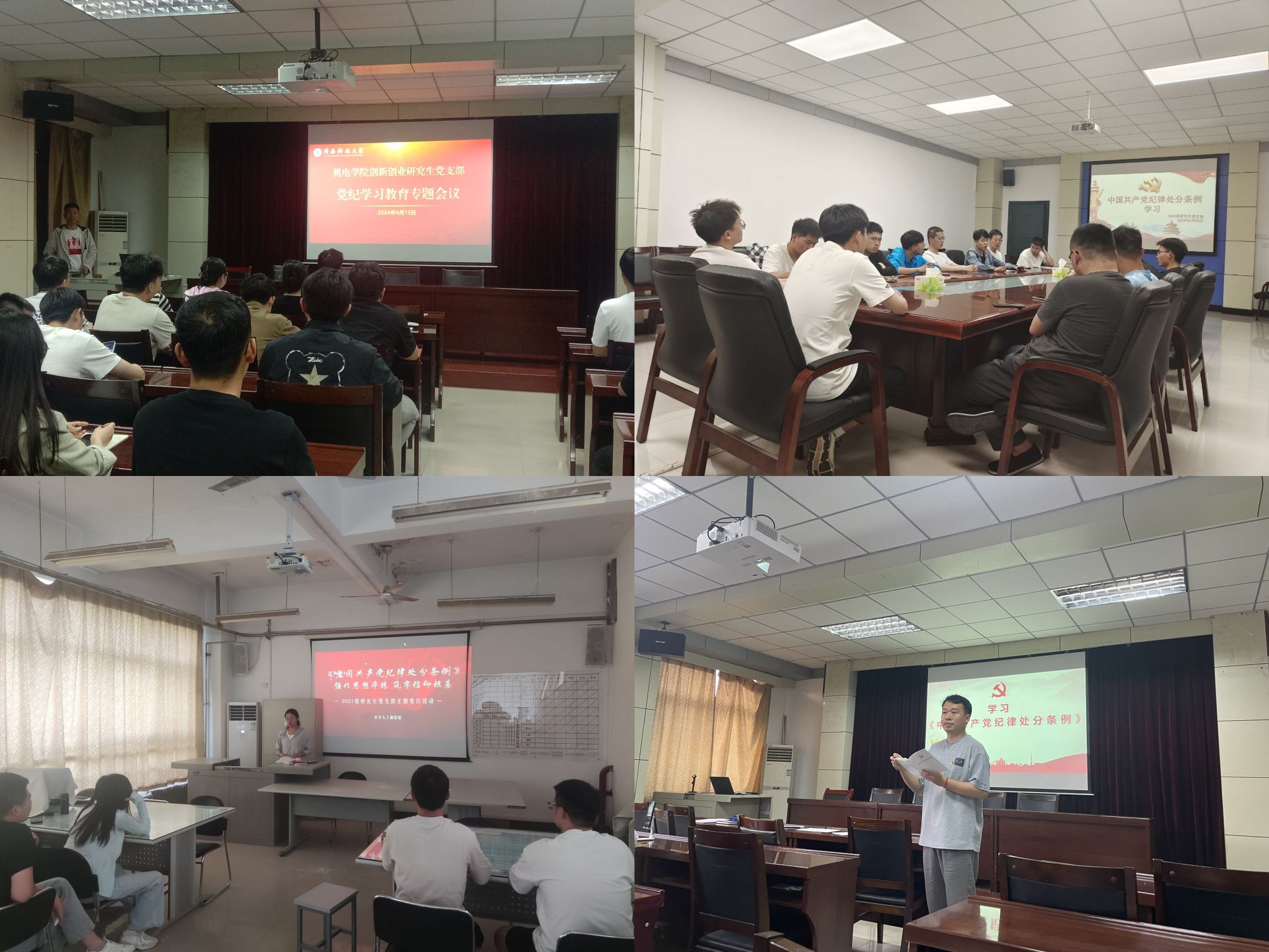 研究生黨支部通過(guò)支部書(shū)記講黨課、主題黨日活動(dòng)、集中學(xué)習(xí)等形式進(jìn)行黨風(fēng)黨紀(jì)專(zhuān)題學(xué)習(xí)。博士黨支部組織觀看學(xué)習(xí)《教育系統(tǒng)違紀(jì)違法典型案例警示錄》,創(chuàng)新創(chuàng)業(yè)黨支部專(zhuān)題研討習(xí)近平總書(shū)記關(guān)于加強(qiáng)黨的紀(jì)律教育的重要論述,2021級(jí)研究生黨支部集中學(xué)習(xí)習(xí)近平總書(shū)記重要文章《必須堅(jiān)持人民至上》,2022級(jí)研究生黨支部逐一分享《中國(guó)共產(chǎn)黨紀(jì)律處分條例》學(xué)習(xí)心得,2023級(jí)研究生黨支部組織開(kāi)展“黨紀(jì)我先知”支部大討論活動(dòng)。通過(guò)理論學(xué)習(xí),使研究生黨員真正從思想上筑起一道永不倒塌的拒腐防變的堅(jiān)固防線。