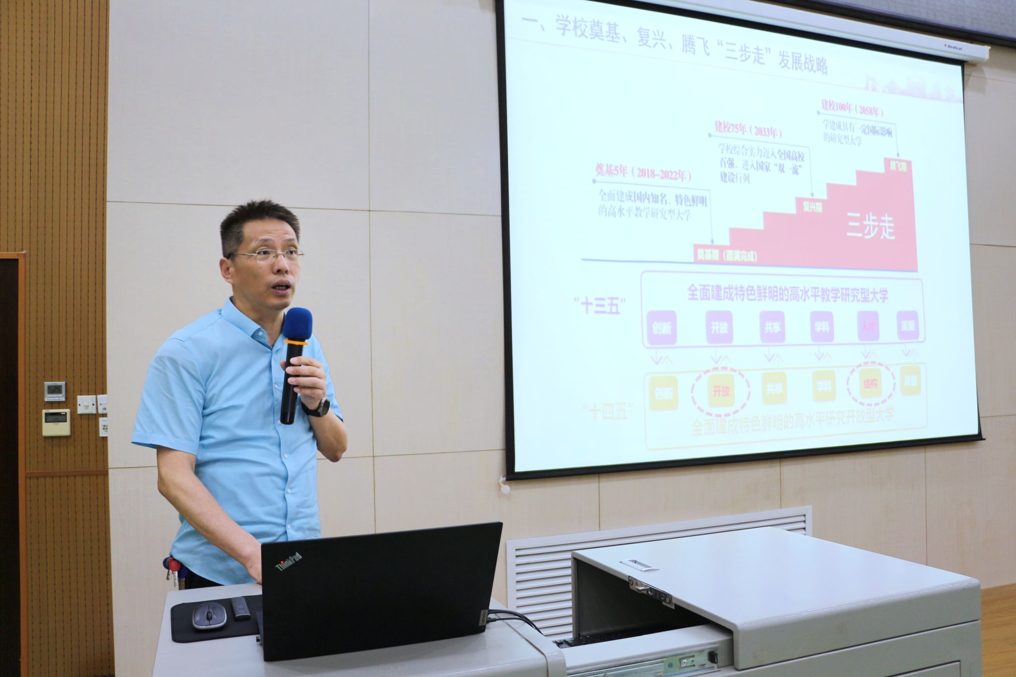 徐永建作《師資隊(duì)伍培養(yǎng)賦能學(xué)校高質(zhì)量發(fā)展》開班動(dòng)員講話,結(jié)合新時(shí)期黨和國(guó)家對(duì)教育的戰(zhàn)略定位,從學(xué)?!叭阶摺卑l(fā)展規(guī)劃,學(xué)科規(guī)劃布局,師資隊(duì)伍及人才培養(yǎng)、學(xué)校當(dāng)前改革面臨的形勢(shì)與挑戰(zhàn)等方面展開,詳細(xì)介紹了以至誠(chéng)計(jì)劃、至博計(jì)劃、卓越計(jì)劃為主要框架的教師培育體系,并對(duì)新進(jìn)教師成長(zhǎng)路徑分享了自己的思考與體會(huì)。他希望青年教師深刻認(rèn)識(shí)新時(shí)代賦予科大人的責(zé)任,懷揣“躬耕教壇,強(qiáng)國(guó)有我”的使命擔(dān)當(dāng),在最好的年華奮楫揚(yáng)帆、砥礪前行,培養(yǎng)更多的優(yōu)秀人才,以實(shí)際行動(dòng)為學(xué)校高質(zhì)量?jī)?nèi)涵式發(fā)展貢獻(xiàn)力量。