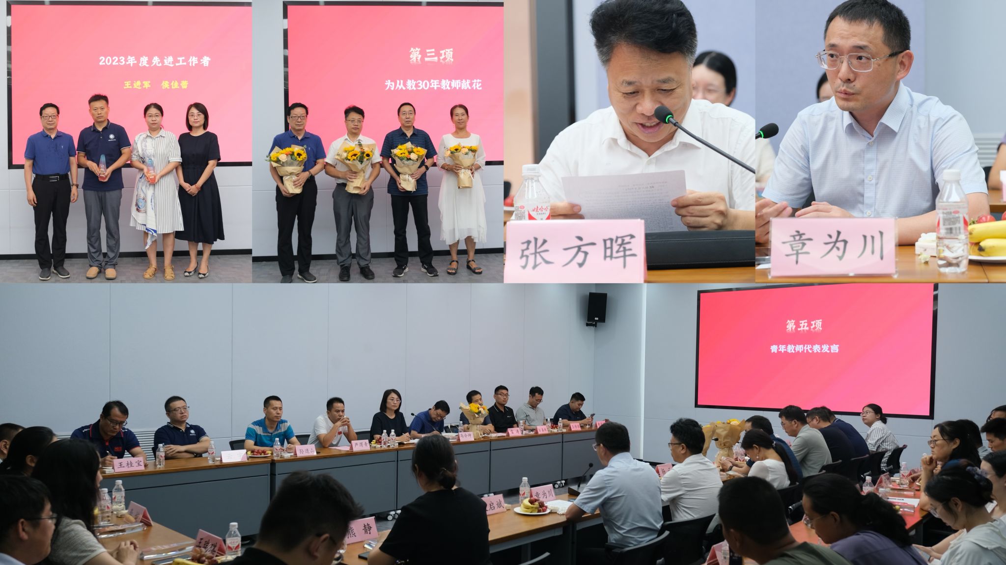 9月9日下午,學(xué)院召開(kāi)慶祝第40個(gè)教師節(jié)表彰座談會(huì),學(xué)院領(lǐng)導(dǎo)班子、從教30年教師、2023年度優(yōu)秀教師、青年教師代表參會(huì),會(huì)議由院黨委書(shū)記呂文華主持。會(huì)議表彰了2023年度“優(yōu)秀教師”“思政先進(jìn)個(gè)人”“師德師風(fēng)先進(jìn)個(gè)人”“先進(jìn)工作者”等24位教師,青年教師代表向從教30年及以上教師送上了鮮花和祝福。院長(zhǎng)馬令坤向全體教師致以最誠(chéng)摯的節(jié)日問(wèn)候,希望老師們始終心懷“國(guó)之大者”,強(qiáng)化使命擔(dān)當(dāng),提高合作意識(shí),加強(qiáng)經(jīng)驗(yàn)交流,進(jìn)一步促進(jìn)我院教學(xué)研究和學(xué)科建設(shè)等工作有序開(kāi)展。呂文華解讀了教育家精神的六個(gè)維度,對(duì)全體教師提出三點(diǎn)期望,一是精神為魂,筑牢信念基石;二是師德為首,彰顯行為典范;三是素養(yǎng)提升,緊跟時(shí)代步伐,努力為培養(yǎng)德才兼?zhèn)洹⒂性鷮?shí)學(xué)識(shí)的新時(shí)代人才賡續(xù)奮斗。